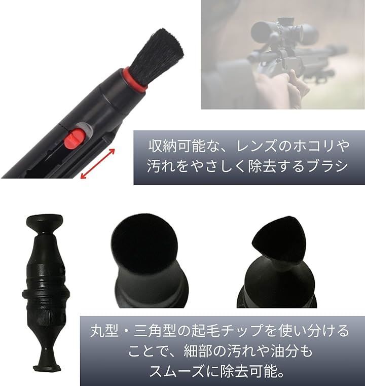精密な光学機器に求められる、レンズ表面の皮脂や指紋、埃などを的確に除去できる設計で、射撃前のコンディションチェックやフィールド射撃後のメンテナンスに有効です。