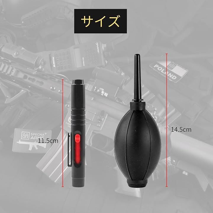 「強力エアブロアーで微細な埃を除去」セットバリエーションに含まれるブロアーは、ゴム製のエアポンプで静電気を抑えつつ強力な風を送り、スコープ外側やドットサイトの照準部分など、繊細な箇所に入り込んだ微細なゴミを素早く排除します。
