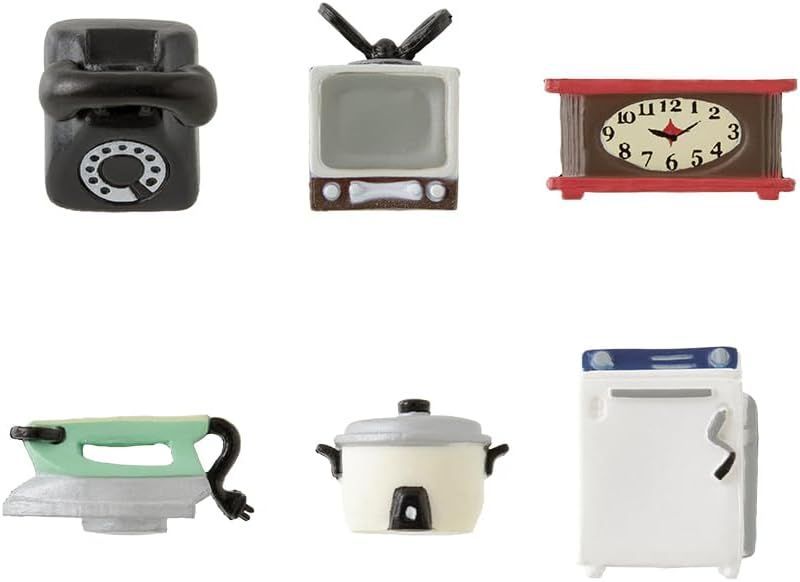 ・テレビ、時計、洗濯機、炊飯器、黒電話、アイロンと古き良き昭和レトロを感じるモチーフを選ミニチュアにしています。