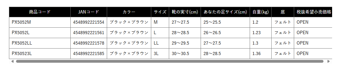 (例:普段のシューズ→Lサイズ(26〜26.5cm) ウェーディングシューズ(フェルト底)→Lサイズ)