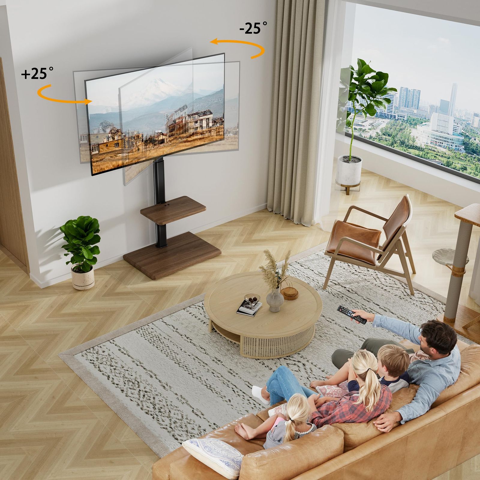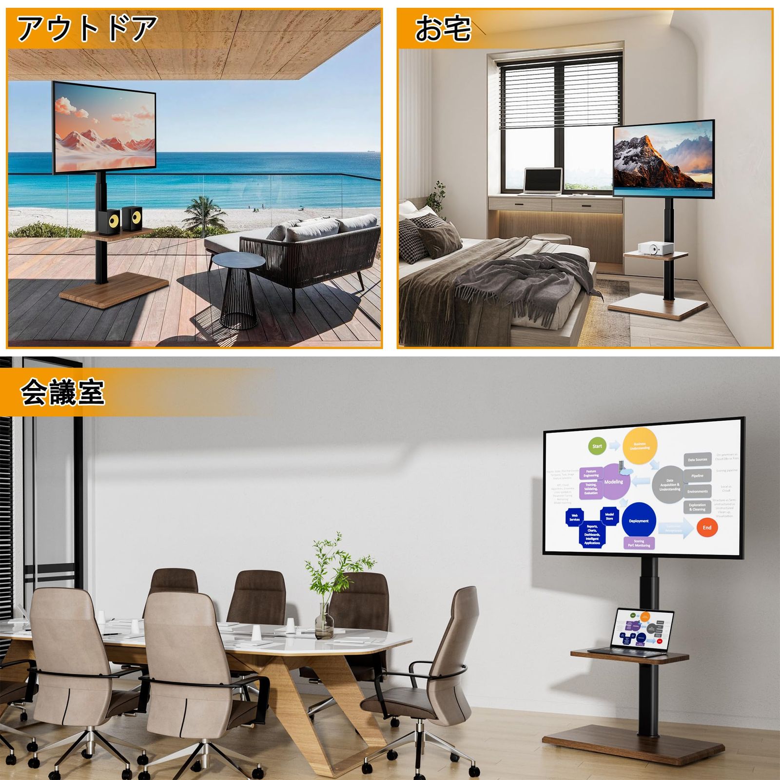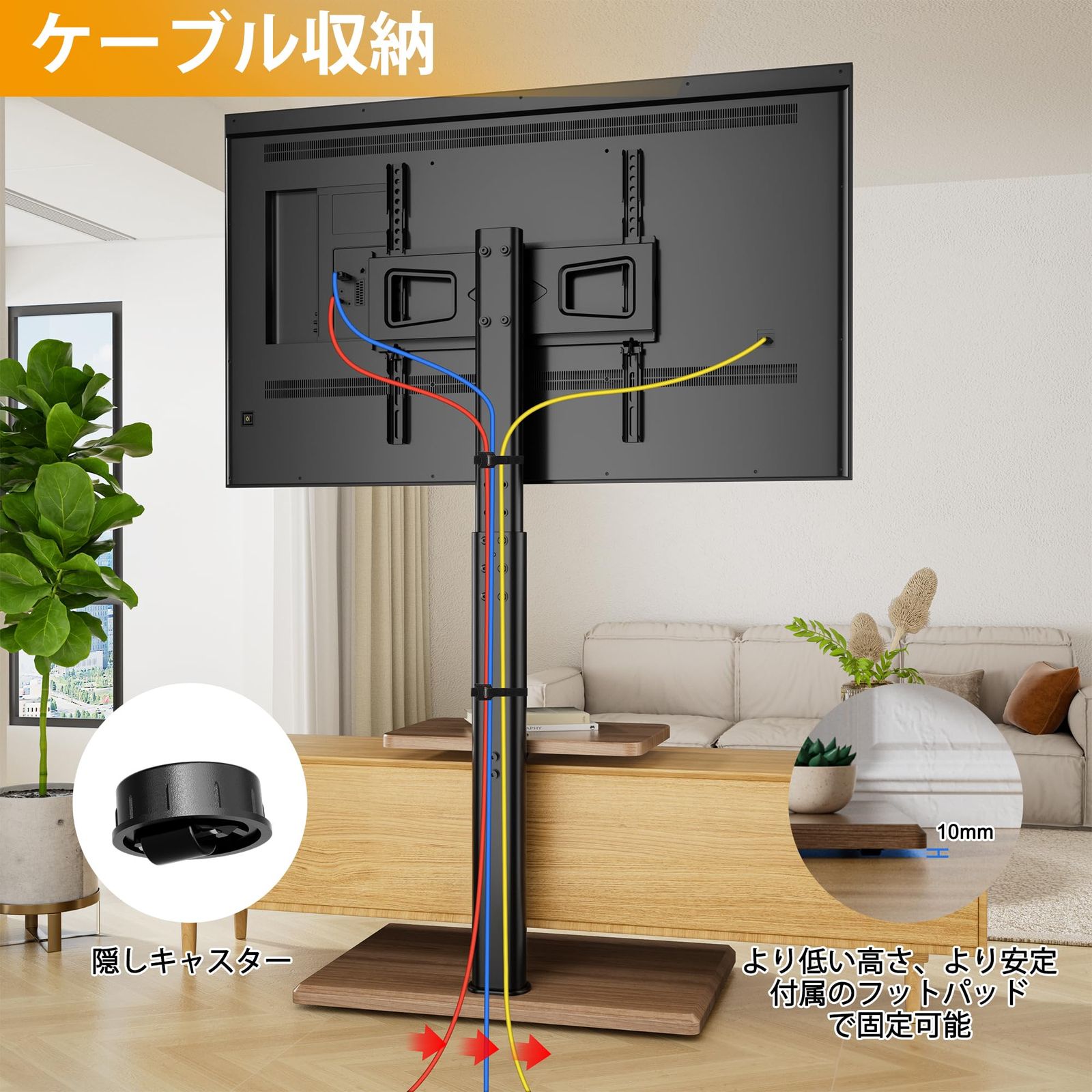 【高さ調節可能】取り付け部中心から床まで、高さがそれぞれ104cm、109cm、114cm、119cm、124cm、129cmに調整できます。異なる身長のユーザーがテレビの高さに対する要求を完璧的に満たし、便利で快適な視覚的な楽しみを実現します。