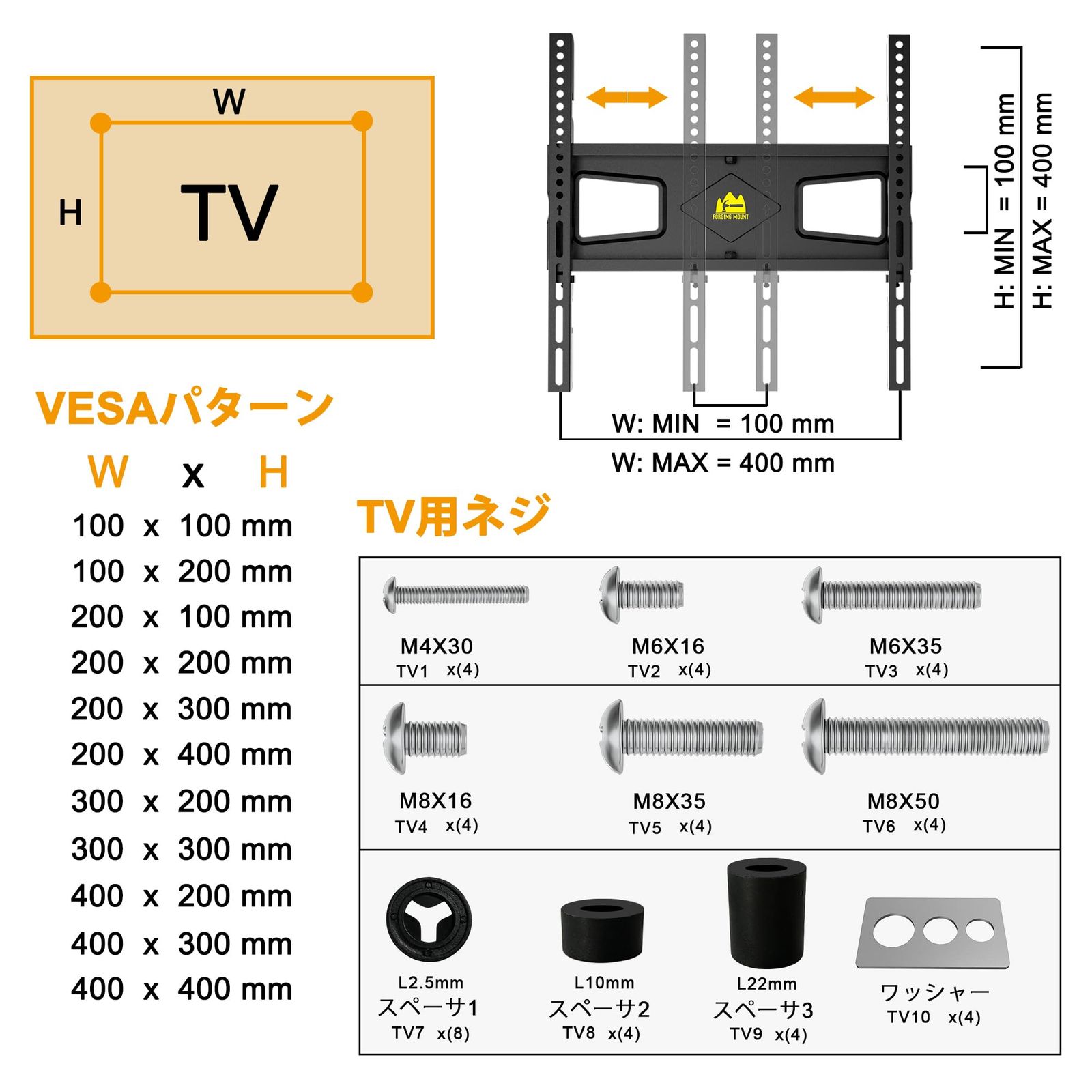 【ご購入前にご確認】①対応インチ:26~65インチ以内。②対応重量:40kg以内。③対応VESA:背面に正方形もしくは長方形に4点のネジ穴が開いています。ネジ寸法は横が100~400mm以内、縦が100~400mm以内が必要です。④対応タイプ:平面タイプ/凹凸/段差/干渉配線があるタイプに対応可能。⑤対応ブランド:ほとんどのブランドに対応可能。