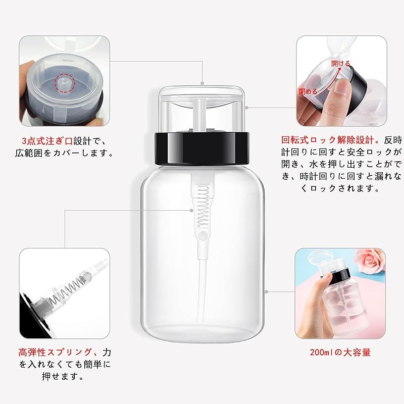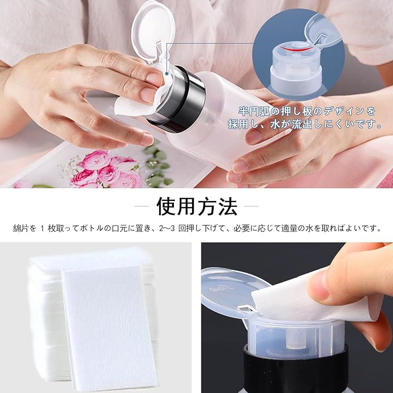 1.ネイルクリーナーボトルの口は半円弧の押し板で設計され、液体が流出しにくい。2.空ポンプボトルは壊れにくく、漏れず、錆びない。 持ち運びが簡単で、生活や仕事に便利をもたらします。3.自宅、美容室、旅行先で使用できます。このネイルリムーバー容器は、多くのシーンに適しています。4.ネイルワイプは高品質のコットン製で、お肌に刺激を与えることがないです。マニキュアの拭き取り、爪の除去、ボトルの洗浄、マニキュアツールの洗浄など、幅広い用途に使用できます。5.ポンプディスペンサーは透明ボディを採用し、容量がはっきり見え、タイムリーに補充することが便利です。
