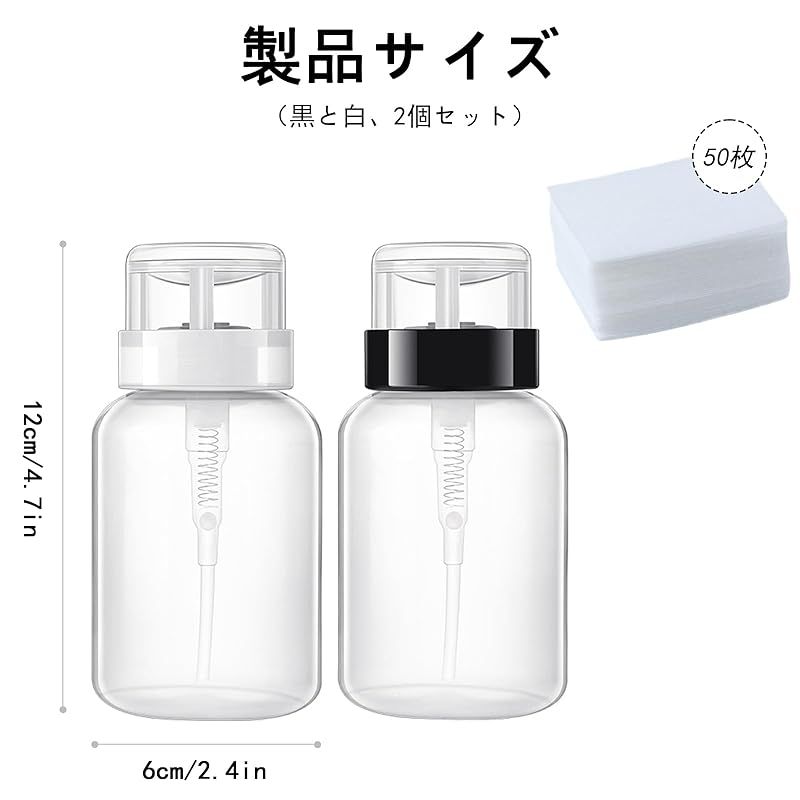 【パッケージ内容とサイズ】ネイルクリーナーボトル、200ml、2個セット、ネイルワイプ50枚。空ポンプのサイズ: 12x6cm(4.7×2.4 in)、ネイルワイプのサイズ:6x4cm(2.4x1.6in)。