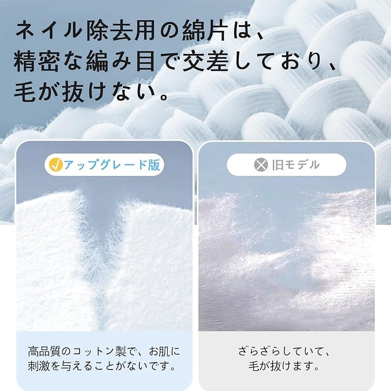 【素材】ネイルリムーバー容器は耐久性のあるpp素材で作られており、安全で無臭、繰り返し使用可能です。ネイルワイプは高品質のコットンで作られ、精密に織られ、変形しにくく、厚手で水を節約し、ネイルアートをよりきれいに取り除くことができます。