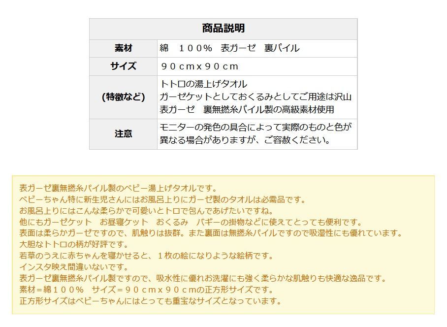 表ガーゼ裏無撚糸パイル製ですので、吸水性に優れお洗濯にも強く柔らかな肌触りも快適な逸品です。