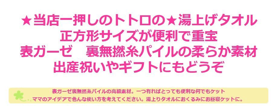 表ガーゼ裏無撚糸パイル製のベビー湯上げタオルです。