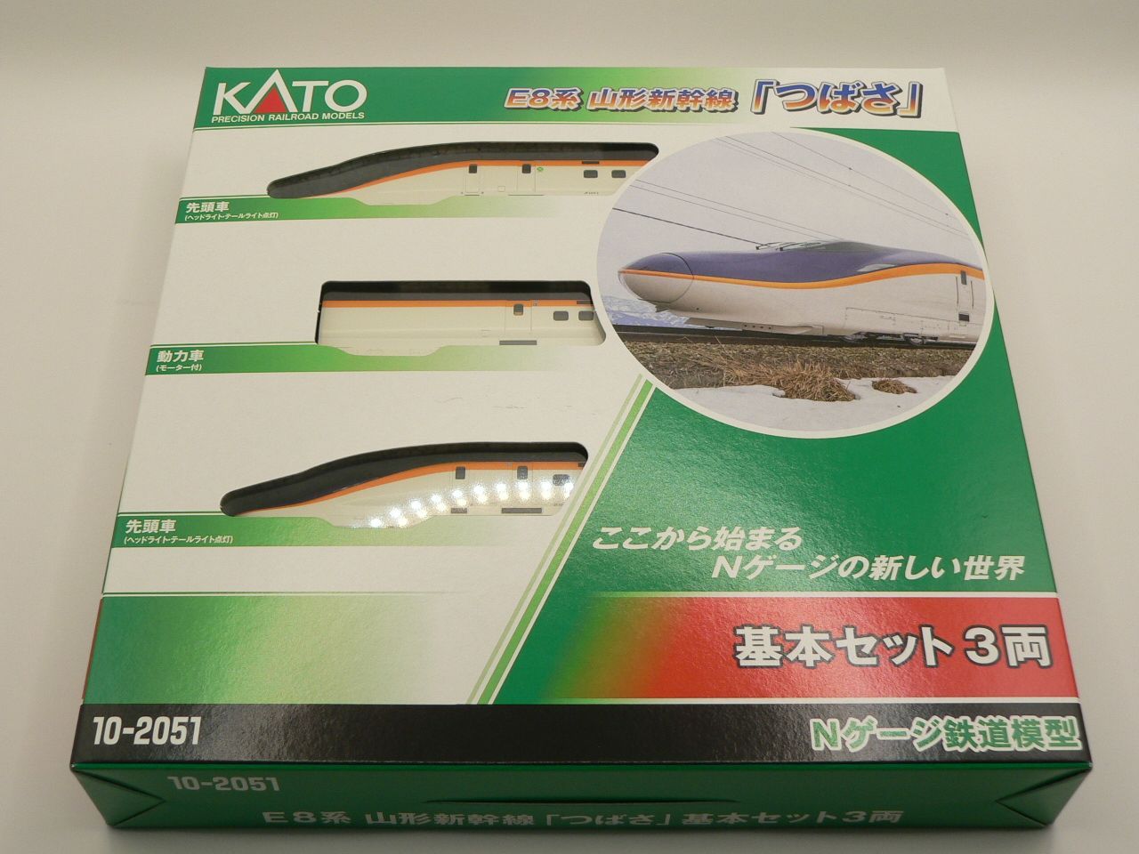 ●E8系は山形新幹線向けの新形車両として令和6年(2024)3月に営業運転を開始しました。E6系をベースに「豊かな風土と心を編む列車」をコンセプトとして、多様な旅行ニーズに対応するため、全車への大型荷物置き場の設置や車椅子スペースの増設などを充実させた車両です。外観は紫(おしどりパープル)、黄(紅花イエロー)、白(蔵王ビアンコ)の三色を用いた、これまでの山形新幹線を踏襲したデザインで、ヘッドライトを両肩に配した「アローライン形状」が特徴です。東京~福島間ではE5系「やまびこ」と併結し、最高速度300㎞/hで運転されています。①JR東日本山形新幹線車両センター所属のG2編成(7両セット)、G3編成(基本/増結セット)を製品化