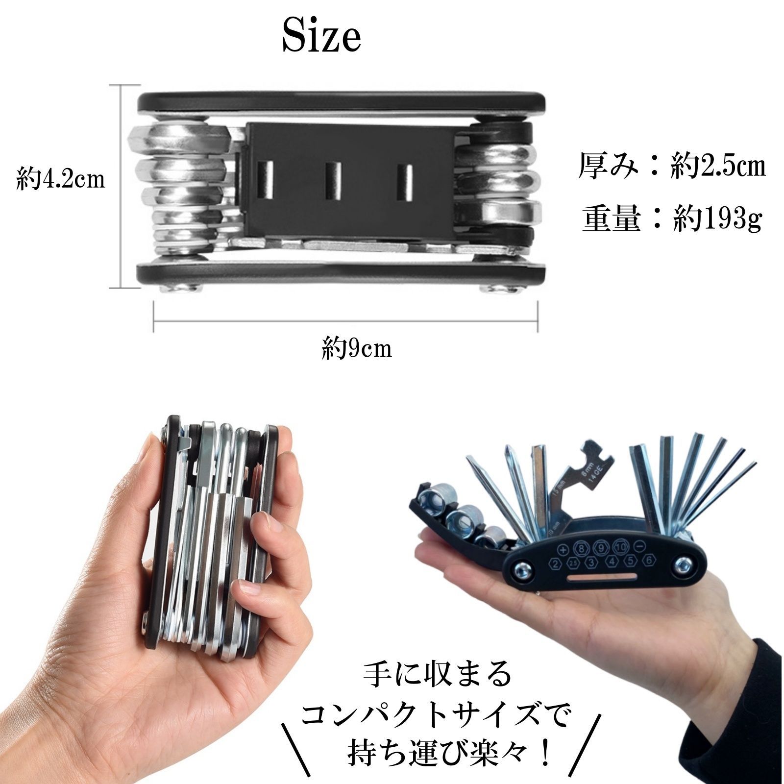 【機能】ソケット六角レンチ(8mm,9mm,10mm)/フラットレンチ(8mm,10mm,15mm)/スポークレンチ14GE/マイナスドライバー/プラスドライバー/ソケット六角レンチ用ロッド/六角棒レンチ(2mm,2.5mm,3mm,4mm,5mm,6mm)