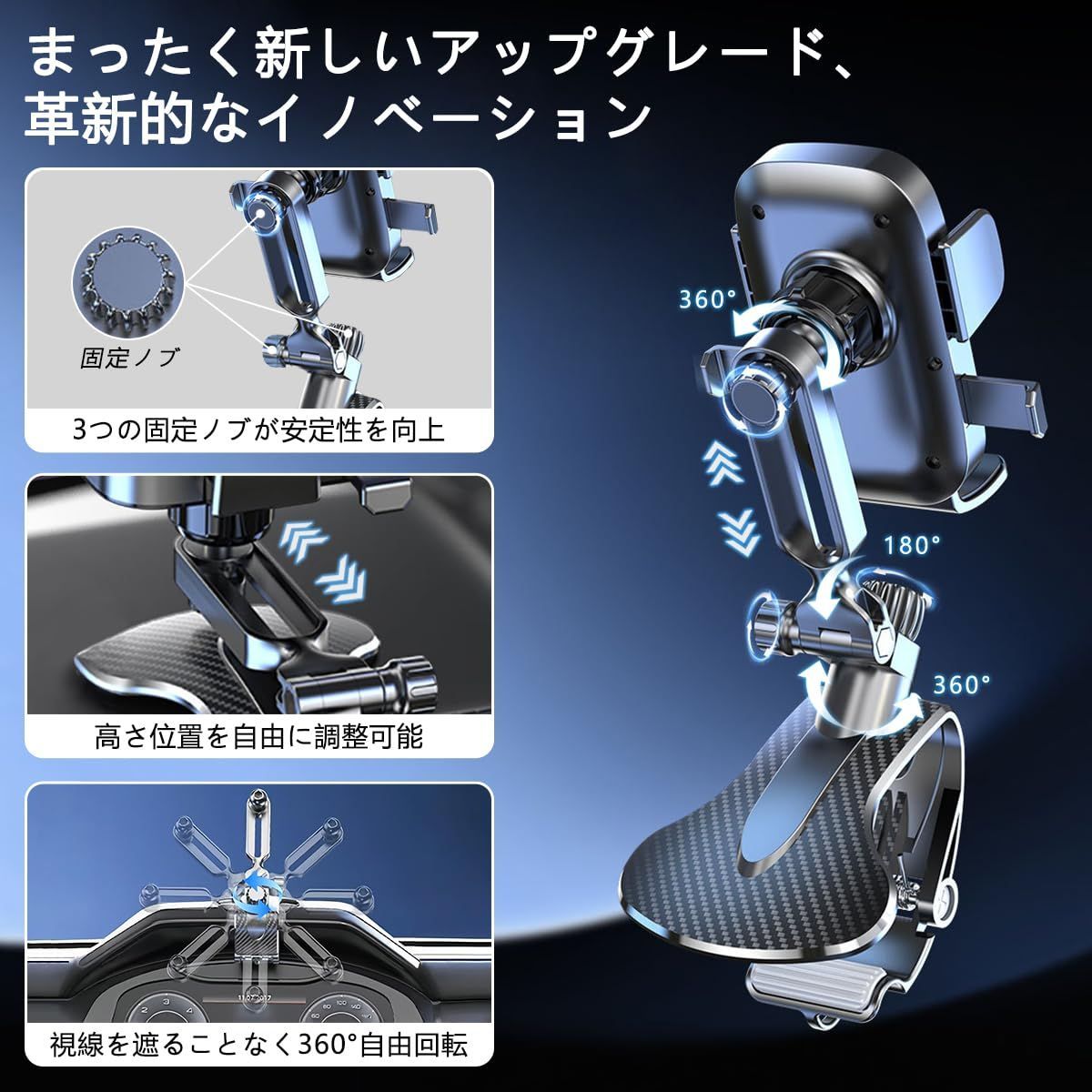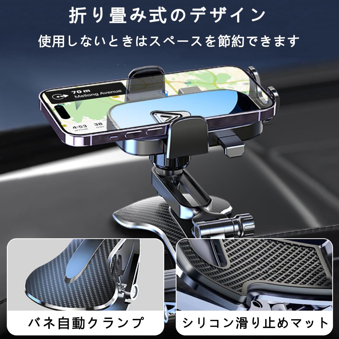 スマホホルダー 車 車載ホルダー 超自由な回転角度 安定性の向上 折りたたみ式 片手操作 インパネ/サンバイザー/バックミラー等 4.0-7.2インチのスマホに適用