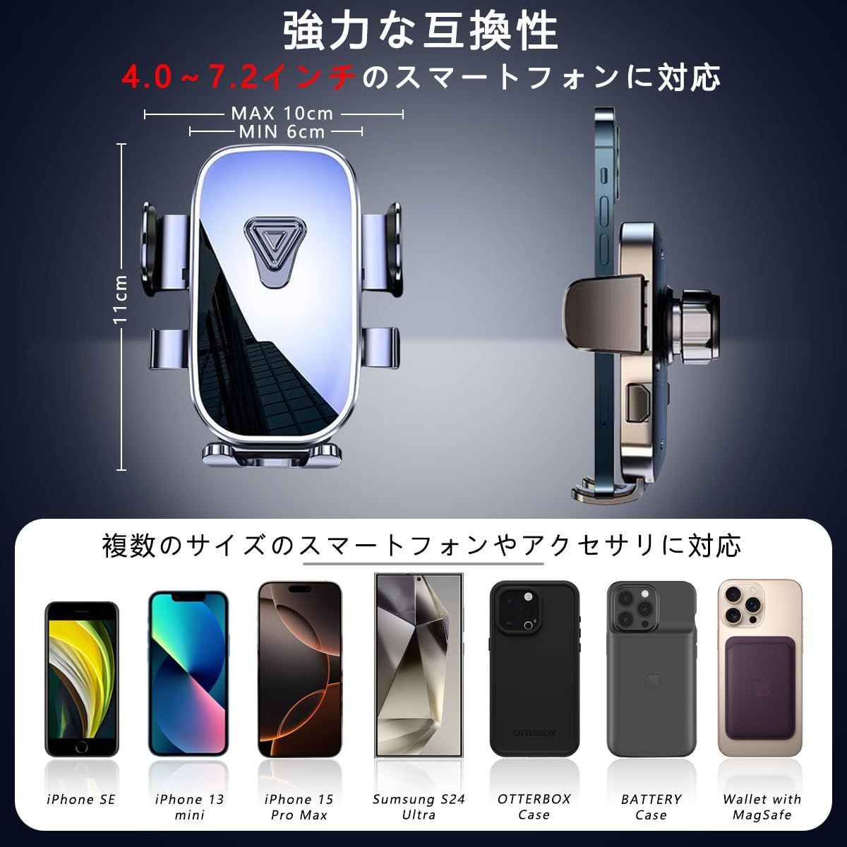 【すべての携帯電話に対応】4.0~7.2インチまで幅広いサイズに対応可能なので、ほとんどのiPhone・Androidなどさまざまなスマートフォンを取り付けすることが可能です。