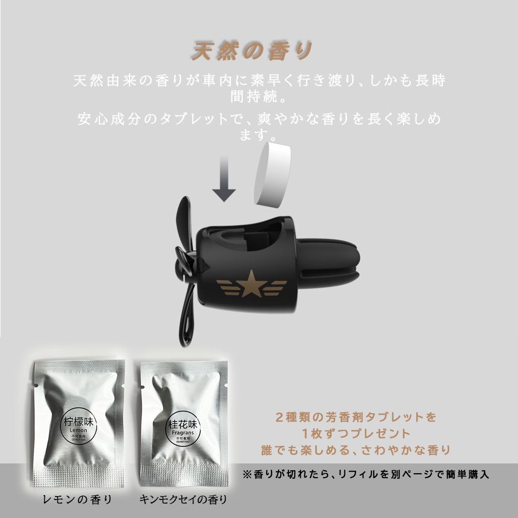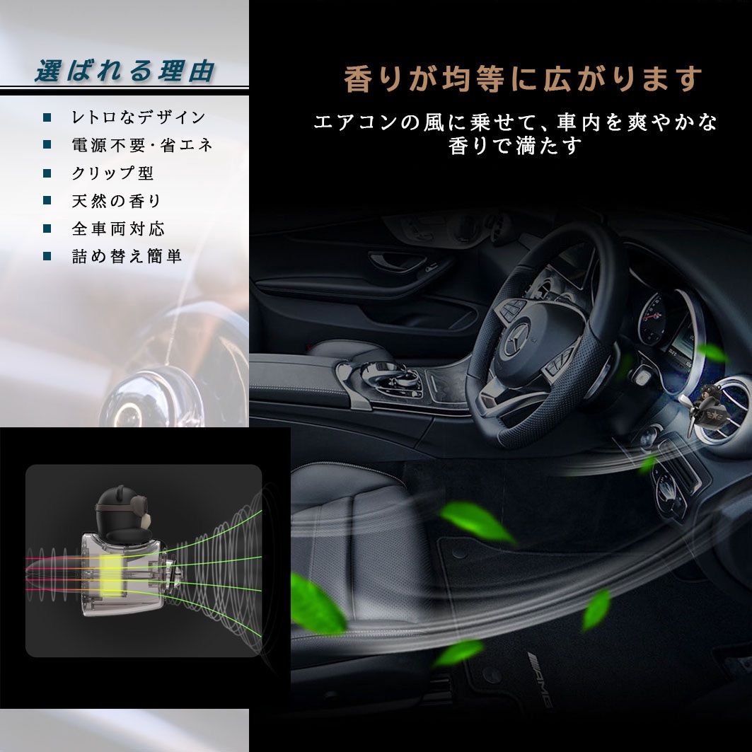 電源やバッテリーは一切不要。エアコンの風でプロペラが回転し、車内を心地よい香りで満たしてくれます。