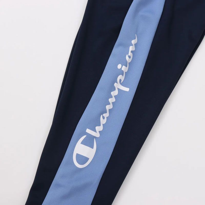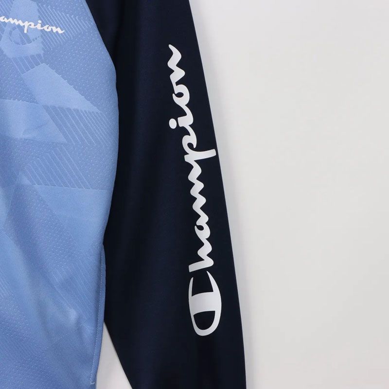 左胸と左袖、パンツ左脇のロゴプリントは、ブラック、チャコール、ブルーには光沢感のあるメタリックプリント、ホワイト、ペールブルー、ライトブルーグリーンにはラバープリントを使っています。