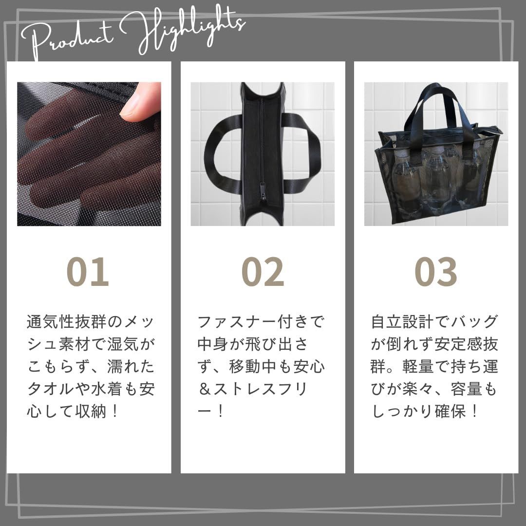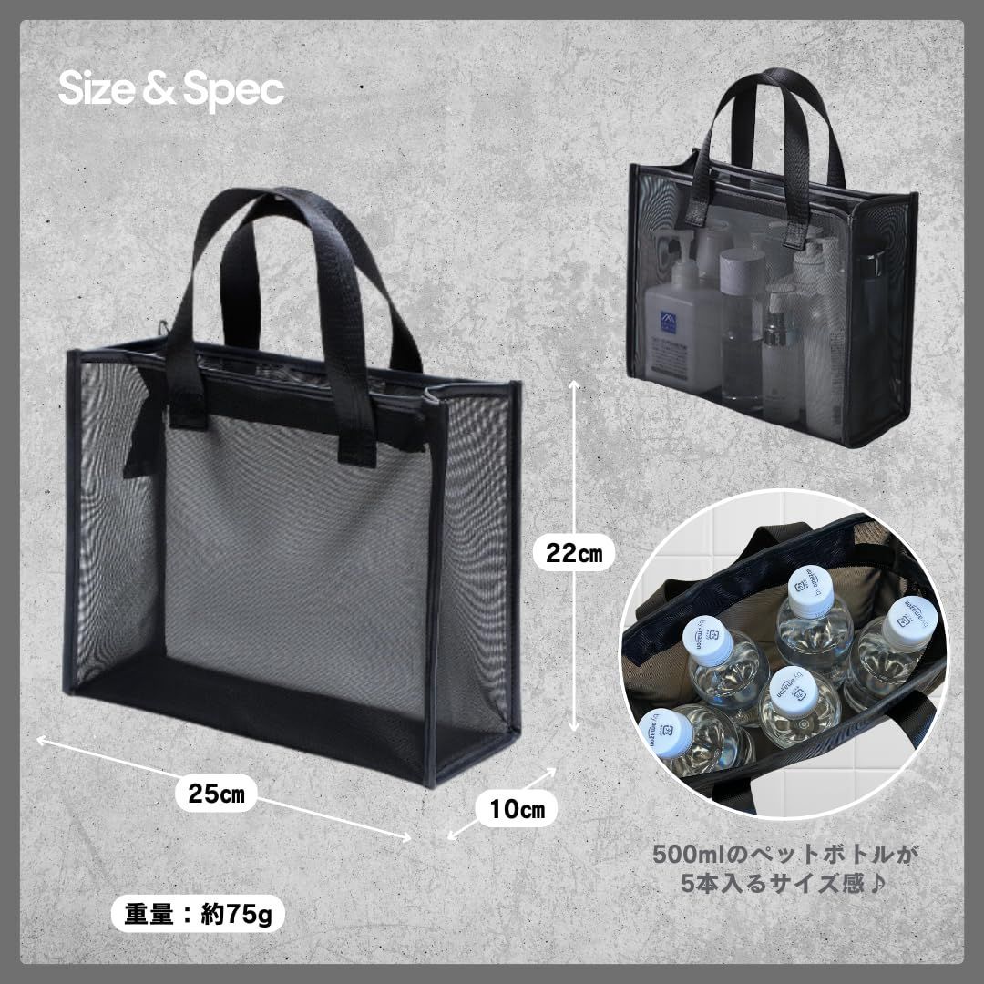 【??メッシュ素材で速乾性抜群??】 バッグ全体がメッシュ素材で作られており、水や湿気をしっかり逃がします。濡れたアイテムを入れても乾きが早く、嫌なにおいもこもりにくいのが特長です。水回りの使用に最適なデザインです。