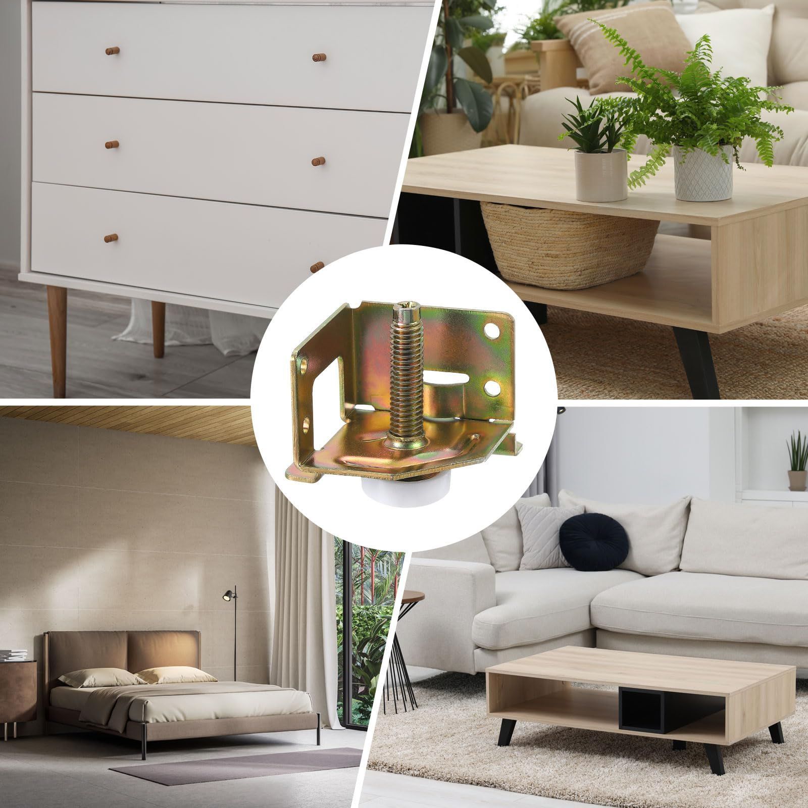 適用範囲:各調整可能な金属レベリングフットは強力な耐荷重能力を持ち、棚ユニ ット、キャビネット、家具の脚、作業台、ベッド、本棚などの家具に適しています。家庭や仕事場で使用される場合でも、これらのレベリングフットはサポートと安定性を提供します。