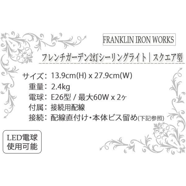 フランクリン・アイアンワークスの「フレンチガーデン2灯屋外用シーリングライト」は、エレガントで洗練されたデザインが特徴の優れた照明です。アウトドアライトとして、玄関照明やポーチライトとして最適です。 このシーリングライトは、アイアン調の素材とガラスシェードが美しく調和したデザインが特徴です。クラシカルな外観とエレガントなスタイルは、輸入住宅や店舗の外照明に最適で、周囲の環境と調和しながらも、独自の存在感を放ちます。 フレンチガーデン2灯シーリングライトは、屋外照明として優れた性能を持ちながら、美しい外観が特長です。アンティークの趣を感じさせるデザインは、屋外空間に特別な雰囲気を与えます。おしゃれでエレガントなシーリングライトとして、屋外の空間を優雅に照らします。