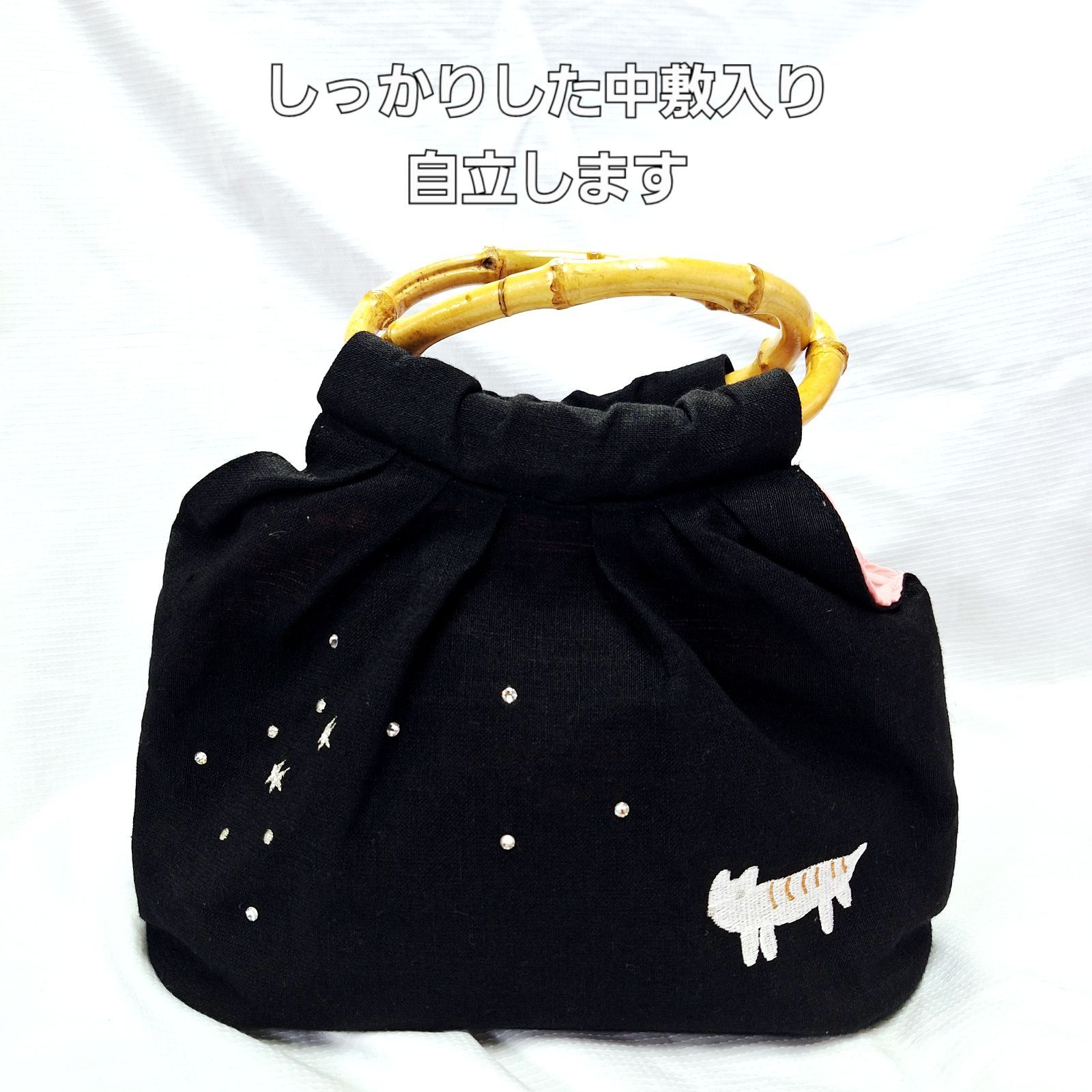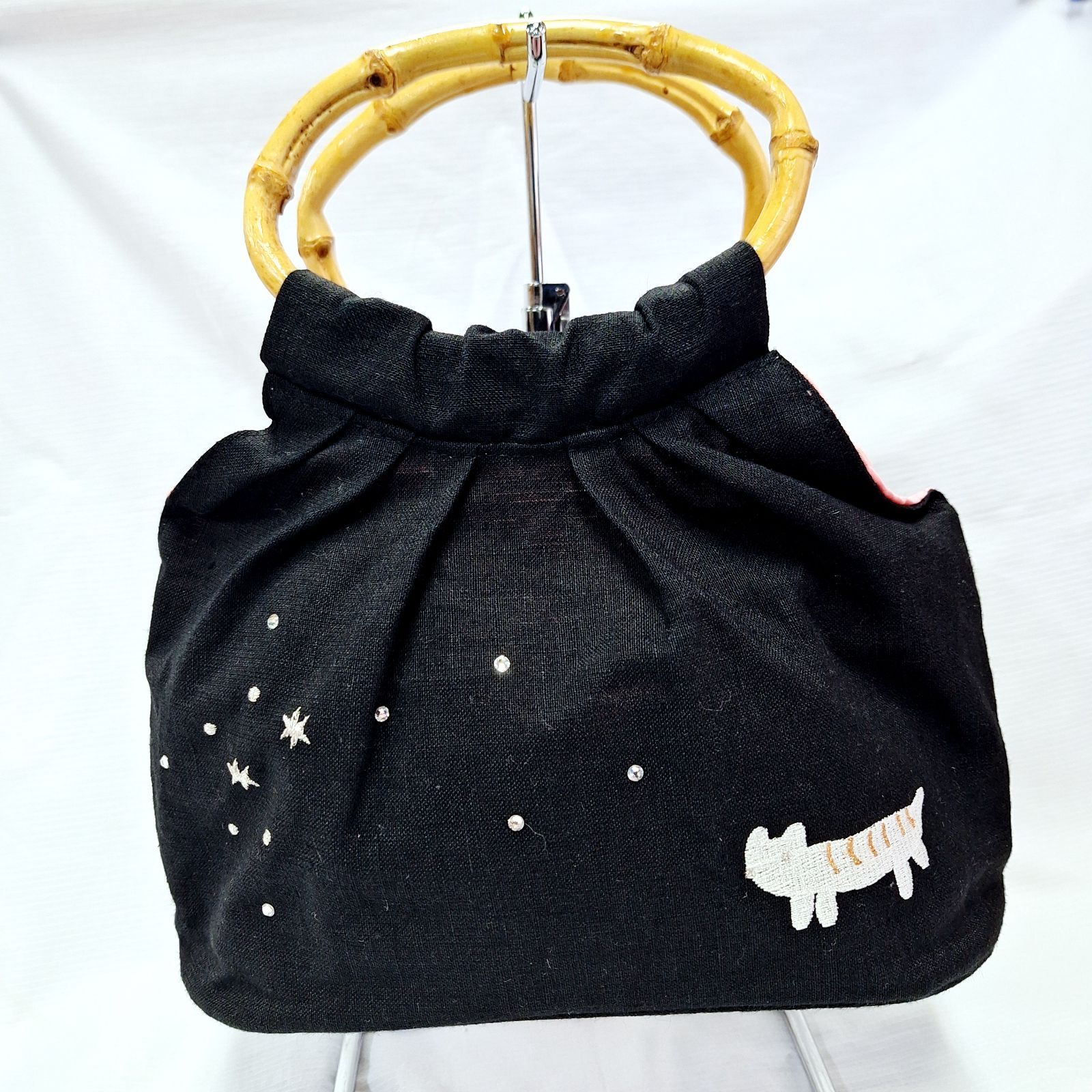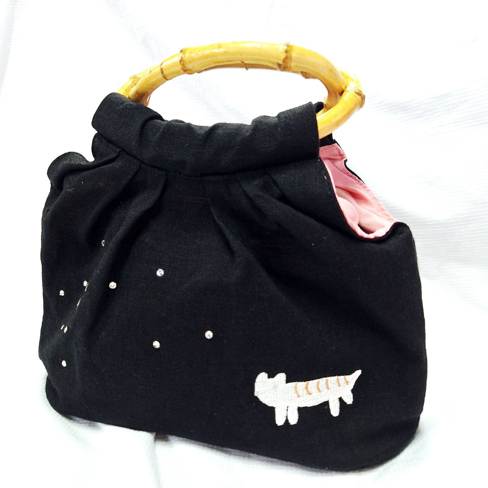 ねこちゃんの刺繍とキラキラのストーンでかわいいデザイン。ちょっとしたお出かけや浴衣着物等の和装、オールシーズンいつでも使えます♪