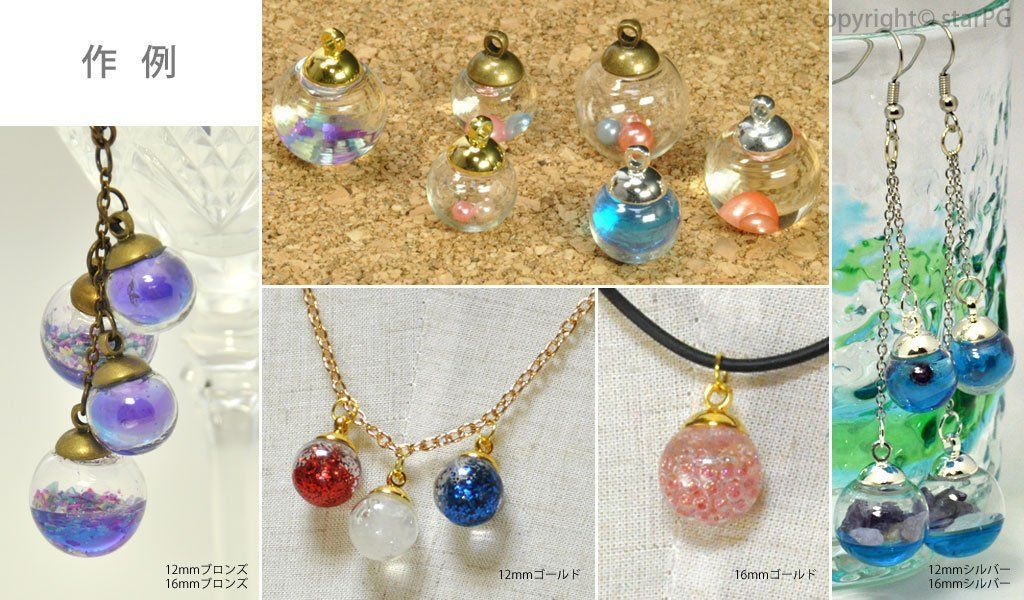 直径18mm、16mm、14mm、12mmのガラスドームと、ゴールド、シルバー、ブロンズのキャップの組み合わせが選べます。ガラスドームの開口部の直径は約3.5mm~5mmです。なお、若干の個体差がありますのでご了承ください。
