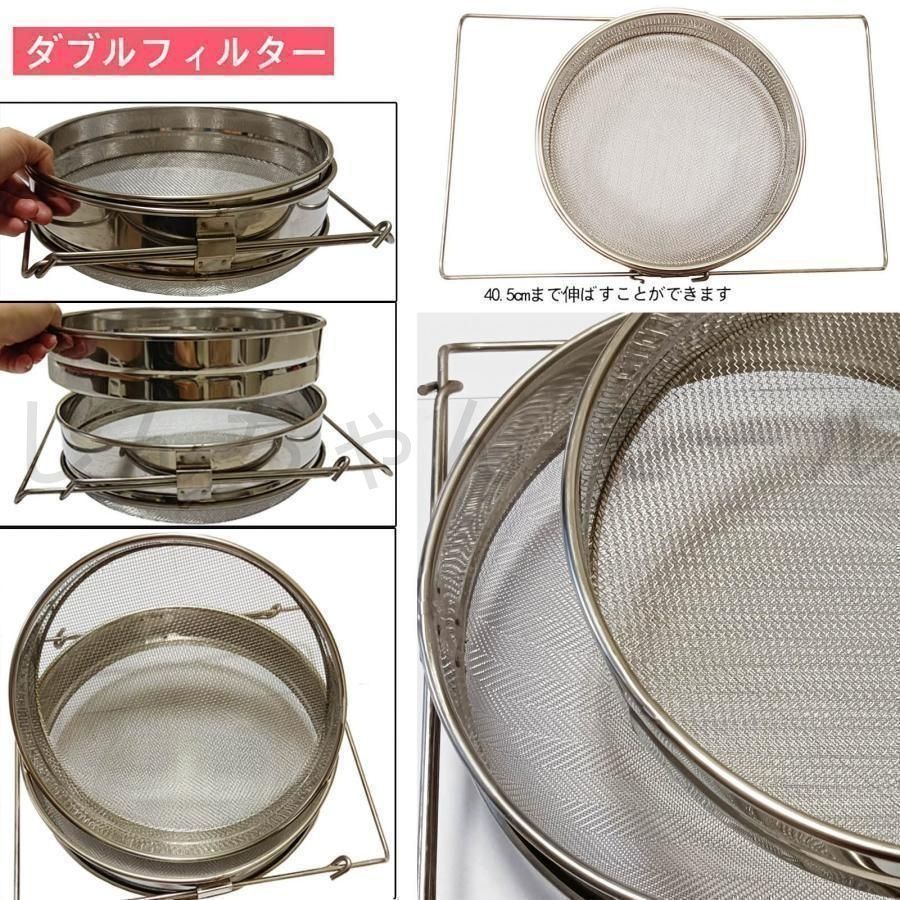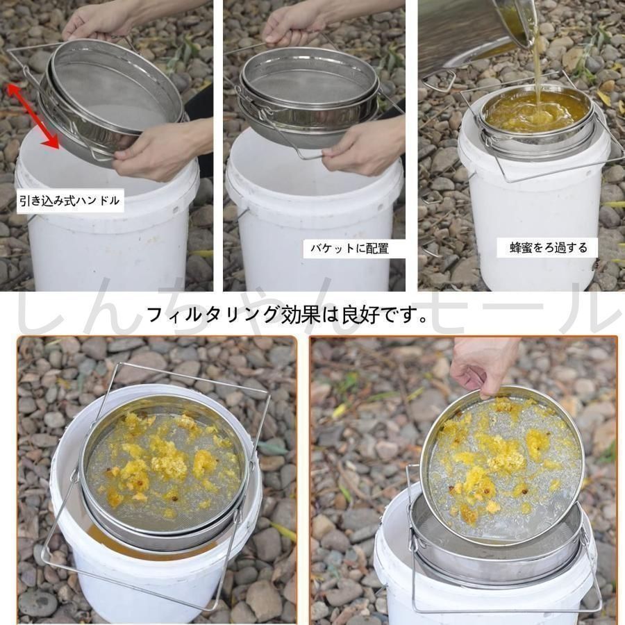 優れたろ過効果:はちみつ こし器には2つの独立したステンレス鋼メッシュがあり、細かく均一なメッシュは、細かい不純物をろ過して取り除くことができます。 分解して蜂蜜中の花粉、ワックス、不純物を効果的にろ過するために使用することもできます。