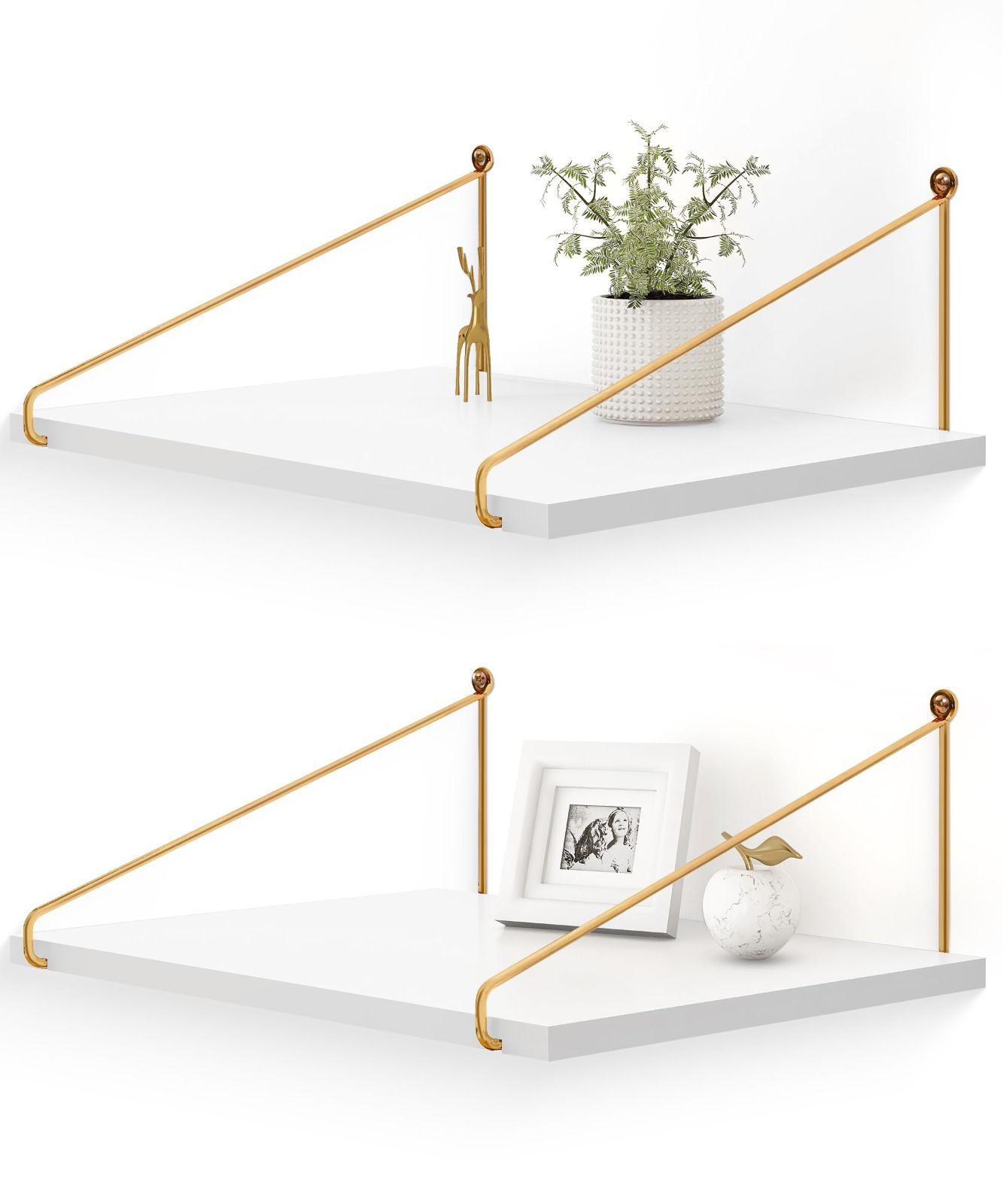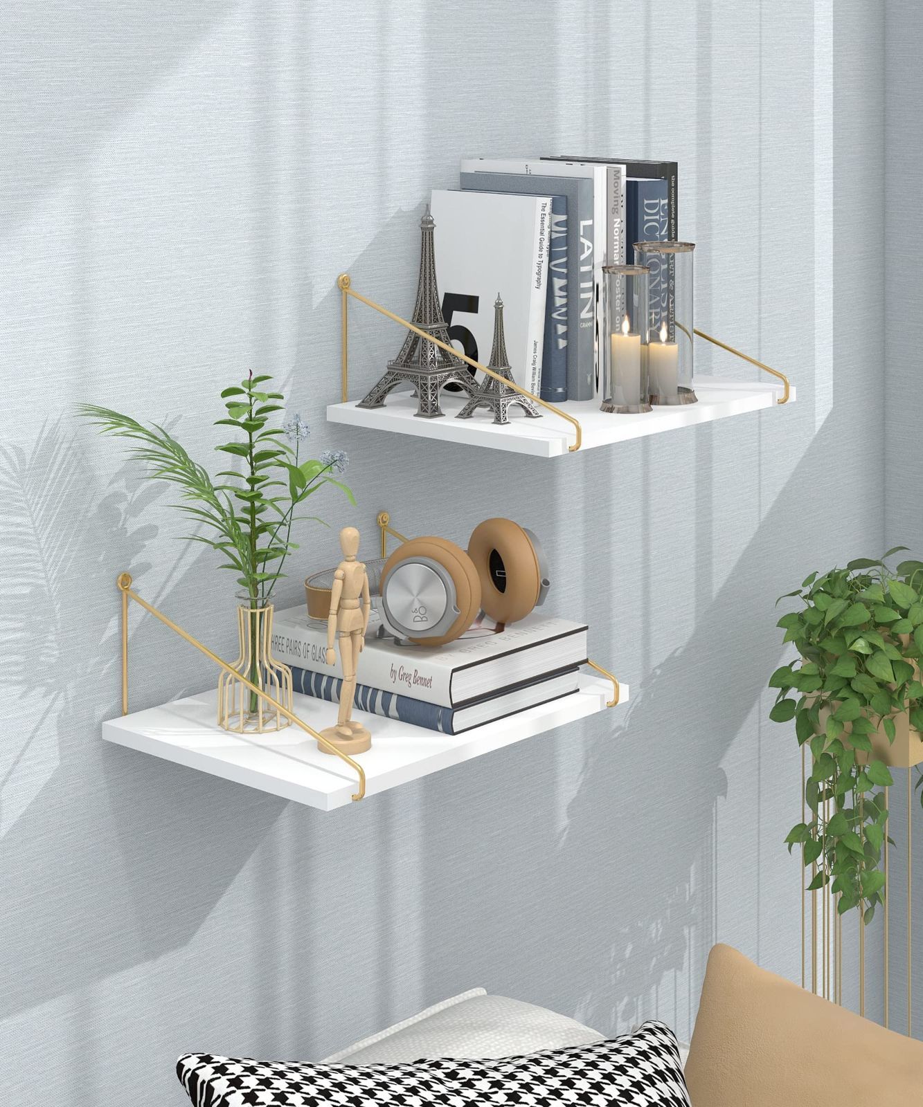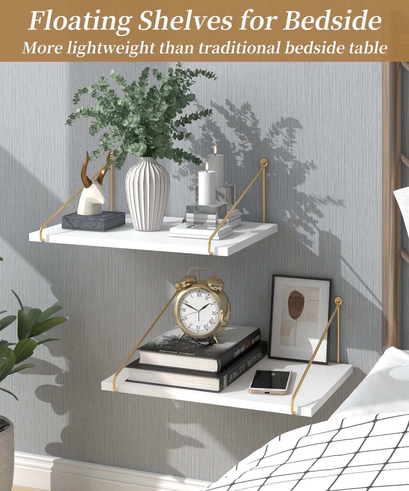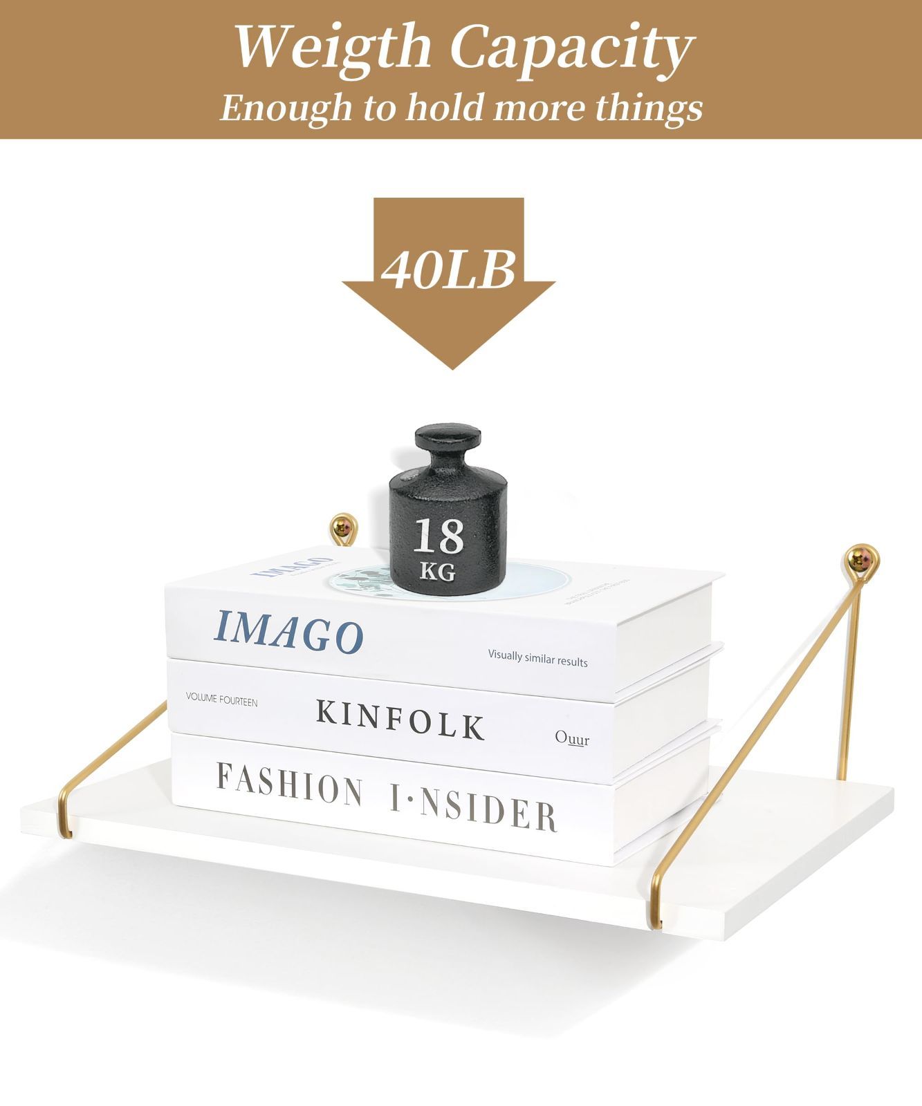 フローティングウォールシェルフは強くて丈夫な松無垢材とゴールドの金属製ブラケットの外観で作られており