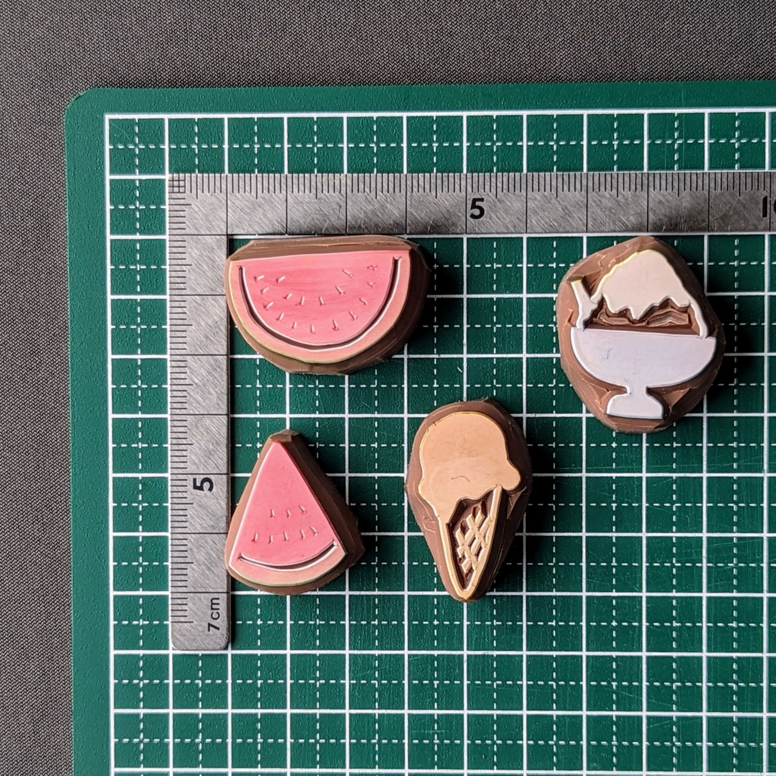 夏の記憶をひと押しに。アイスクリーム、スイカ(三角/半月)、かき氷をすっきりとアイコン化しました。