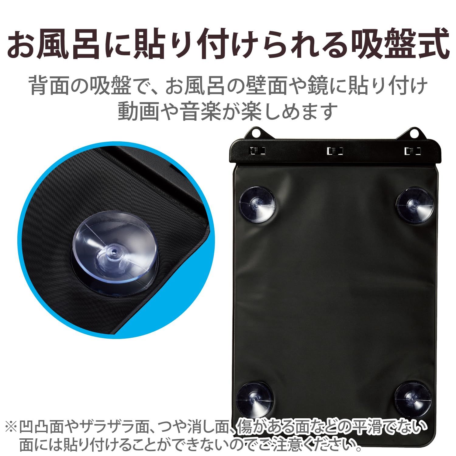 ■背面の吸盤で、お風呂の壁面や鏡に貼り付けて動画視聴や音楽鑑賞ができます。