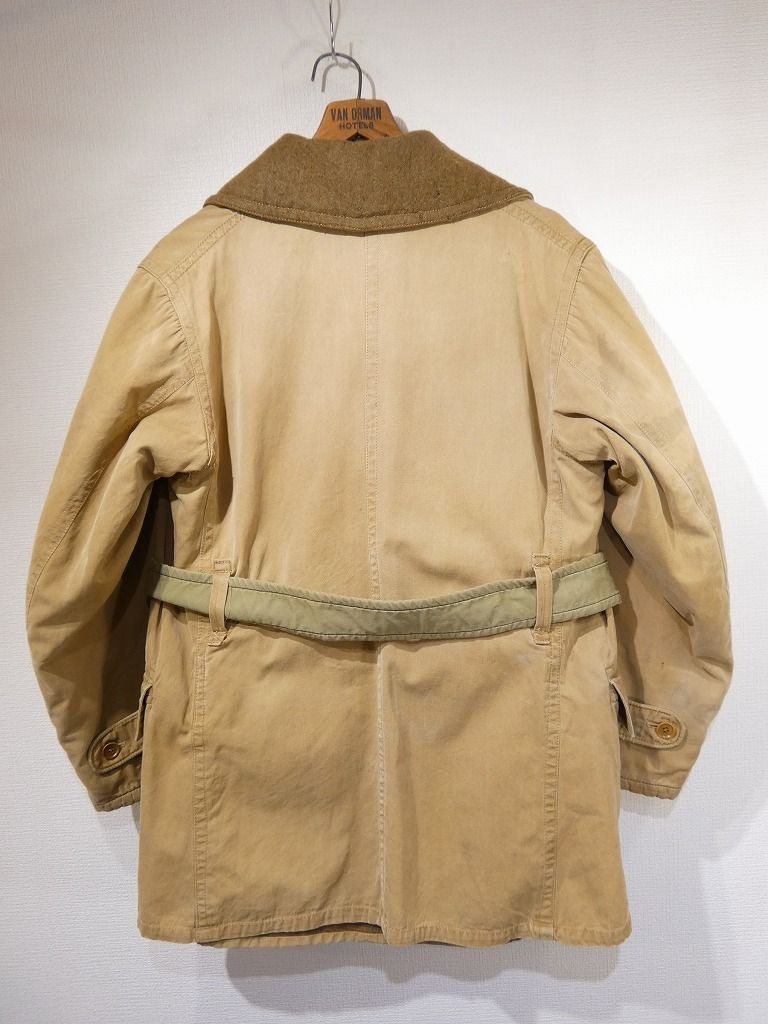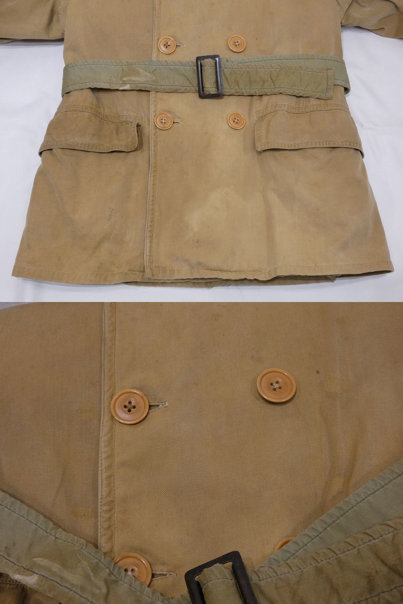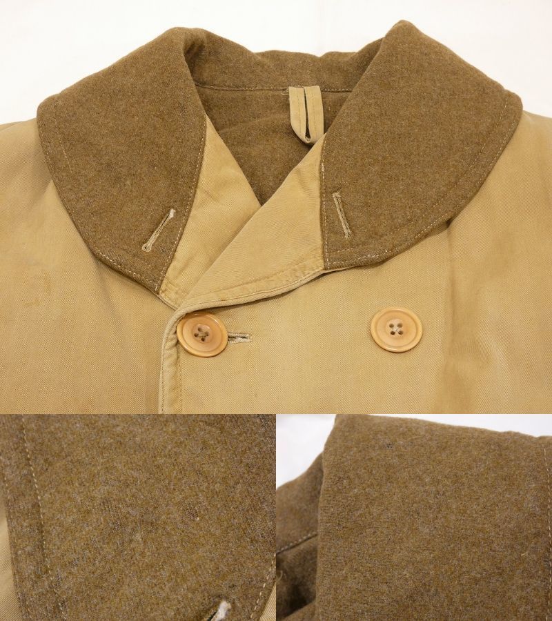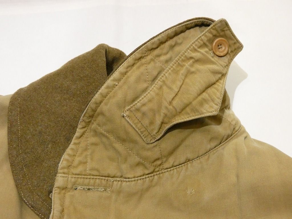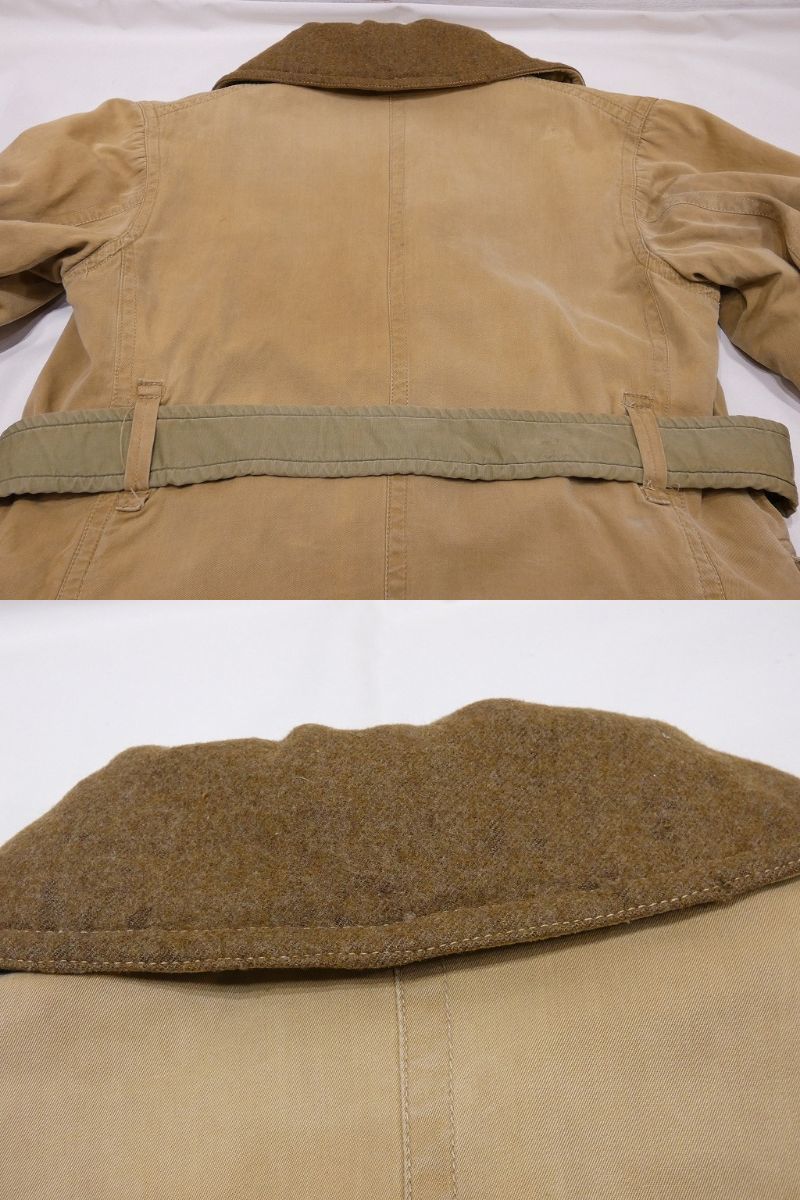 コンディションはやや使用感があり、襟のウールに僅かな虫食い、トップボタンが欠損、フロントのベルトループの欠損、表面に薄シミやヨゴレ、袖ボタンの1つ交換、袖先にスレ等が見られますが、着用に問題は無くまだまだ長く愛用できると思います。