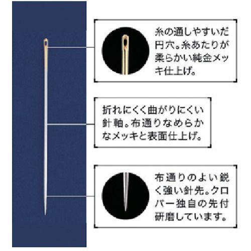 ●ニッケルメッキ後、クロバー独自の先付研磨(先直し)で、針先から0.5mm位の所を円錐状に研削し、尖った針先を強化。また、針先から針軸へゆるやかな曲線にすることによって布通りのよい針先にしています。