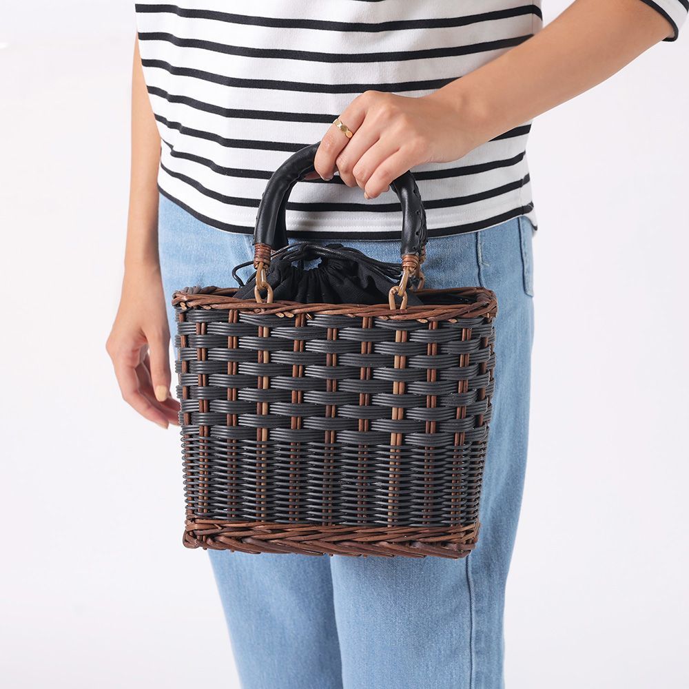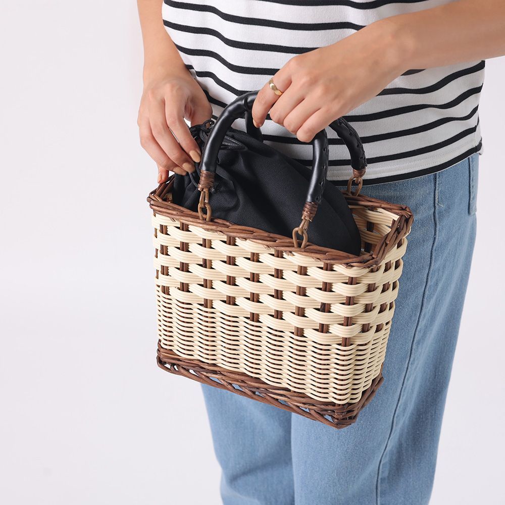 天然素材の柳とポリプロピレンコードの組み合わせにより、立体的な編み柄が引き立つデザイン。膝上にちょこんとのる小ぶりなサイズですが、スマホにお財布、化粧ポーチ、ペットボトルが入ります。付属の巾着は見せたくないモノや貴重品の収納に。そのまま違うバッグに入れ替えできて便利です。