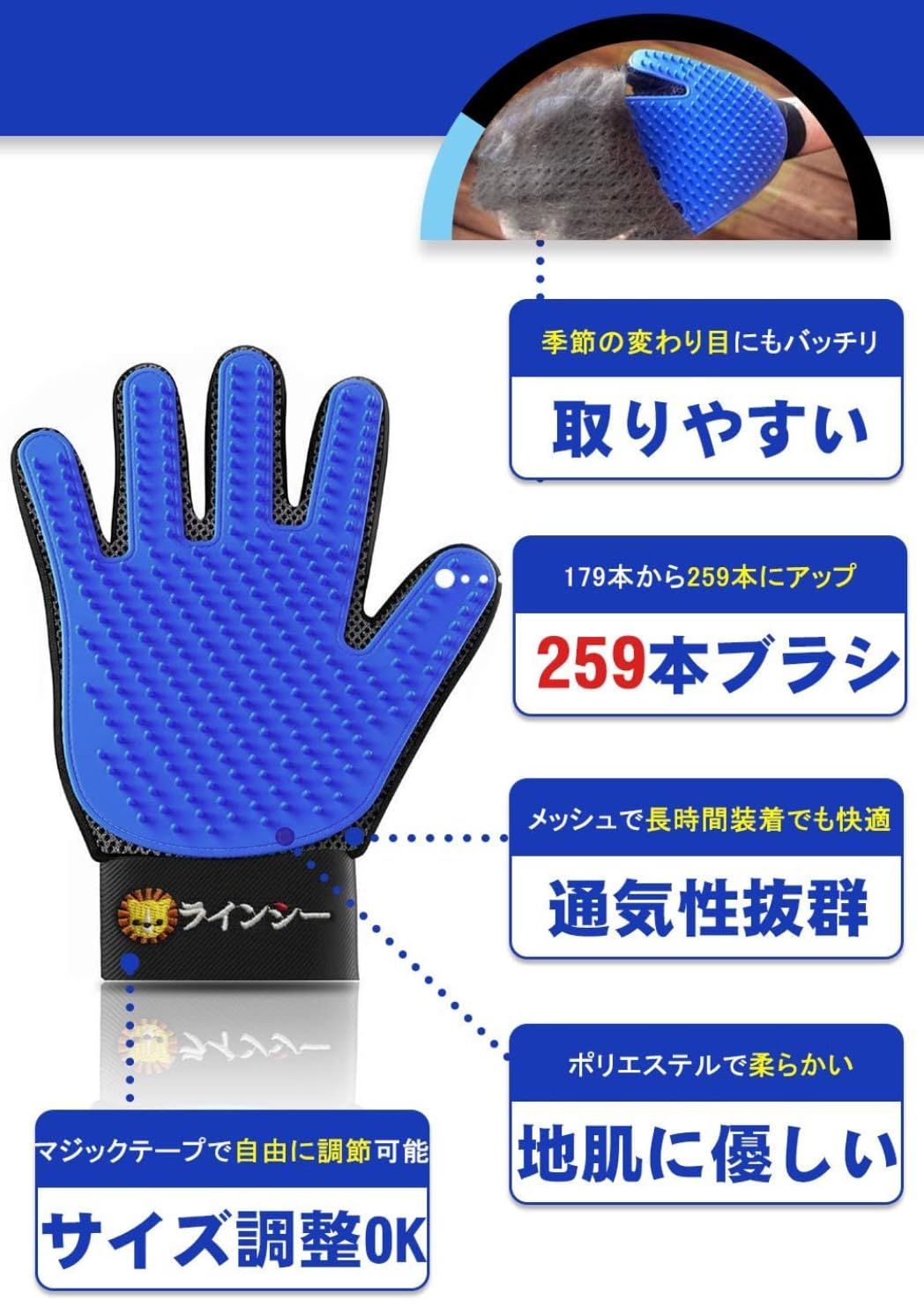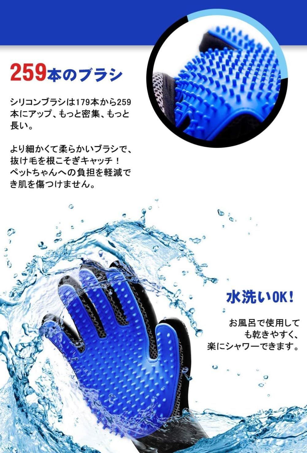 LINECY ペット ブラシ 手袋 グローブ 【259本ブラシ&左右1ペア】ブラシ ペット 猫 犬 うさぎ グルーミング ブラッシング 猫手袋 クリーナー 毛とり手袋 ペットグローブ グルーミンググローブ 毛 けとり 猫毛取り 猫ぶらし短毛用 お風呂用 (ブルー)1ペア