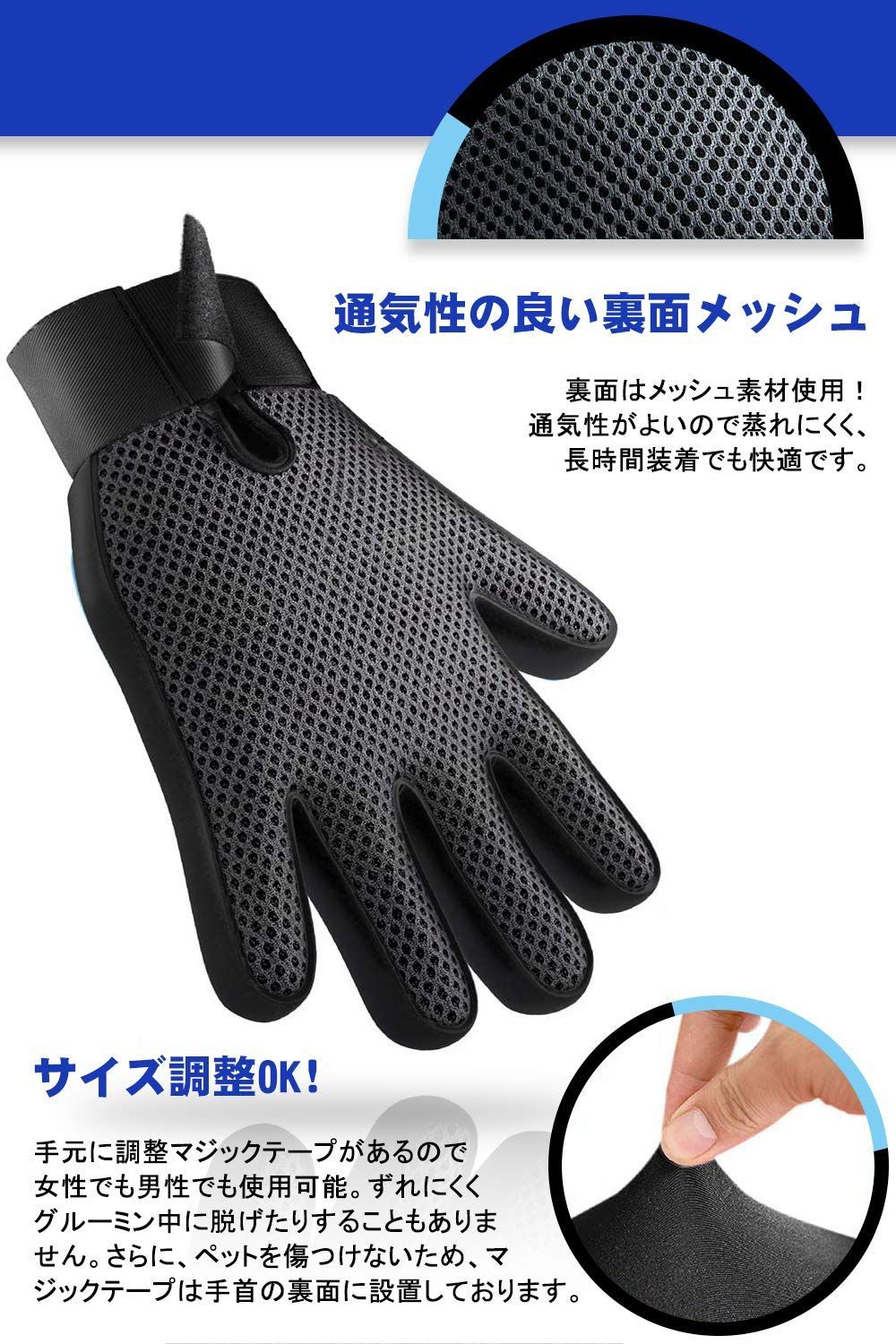 【マジックテープでしっかり固定】 手首に調整可能なマジックテープ付きで男女兼用。犬 くしや猫 コームと違い、グルーミング中にずれない設計。犬用品・猫用品として毛玉除去に最適なペットブラシ。ペットの毛取り、ペット ブラッシングを快適に。
