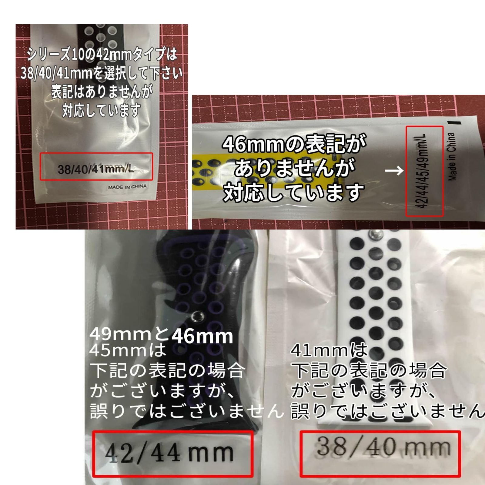 41mmの場合、パッケージに38/40mmと表記している場合がございます。また44 45 46 49mmの場合、パッケージに42/44mmと表記している場合がございますが、いずれも問題なく使用可能です。シリーズ10の42mmは、38/40/41mmのサイズの方をご選択ください。