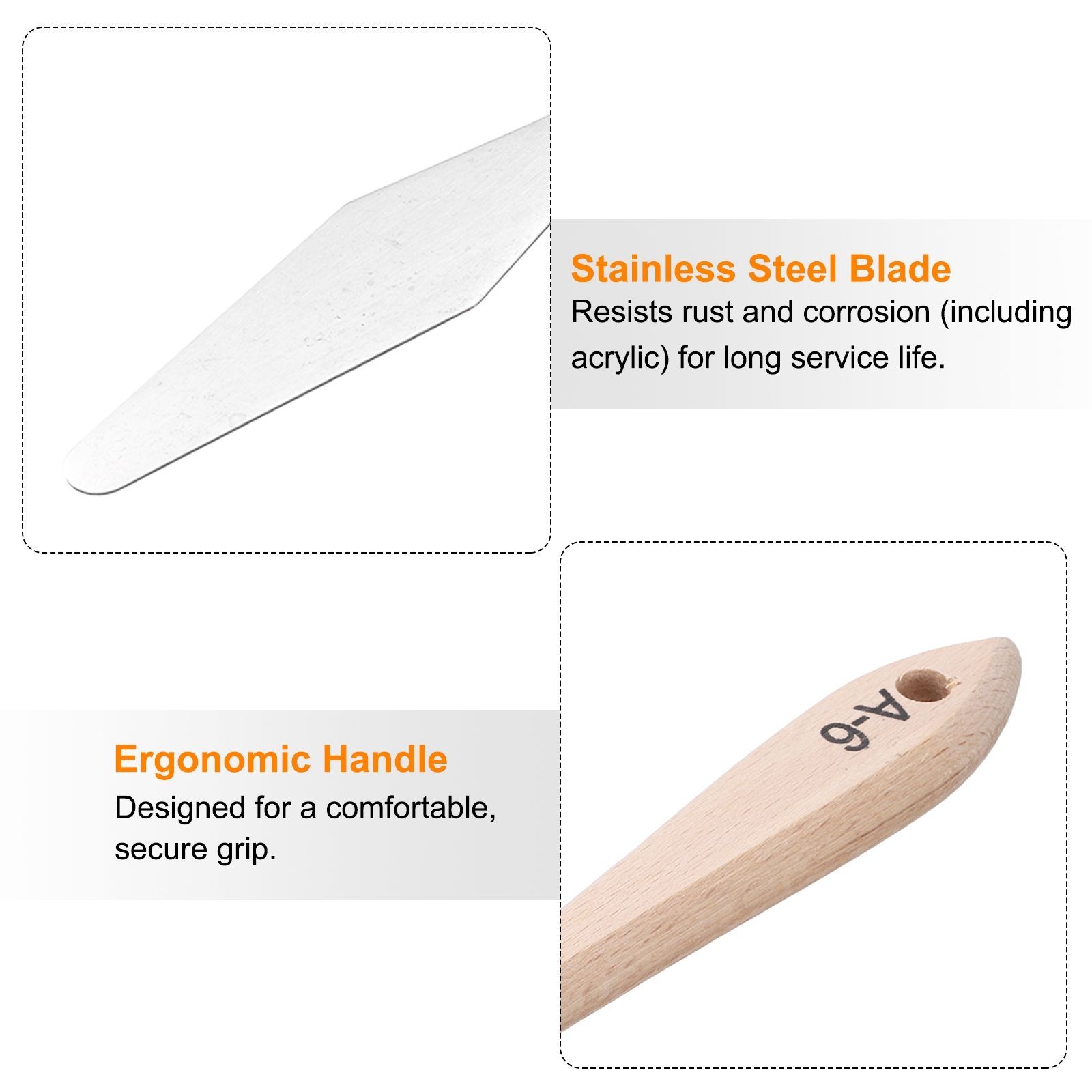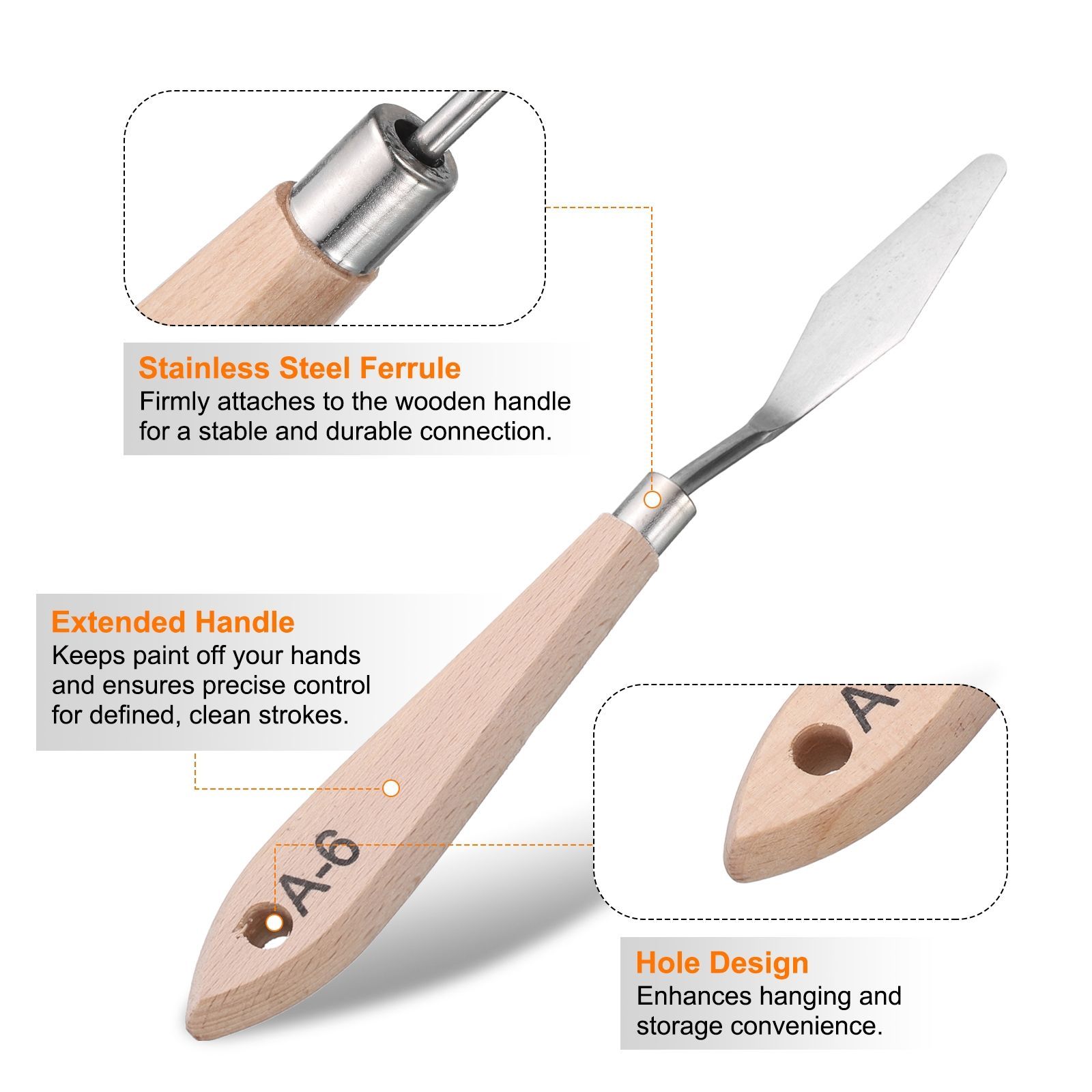 素材 - ブレードはステンレススチール製で、一貫したパフォーマンスと耐久性を提供します。しっかりしたグリッ プと安定した使用を提供する木製ハンドルと組み合わせられています。この組み合わせは実用的な機能性とクラシックなデザインを確保し、頻繁なペイント活動に適しています。