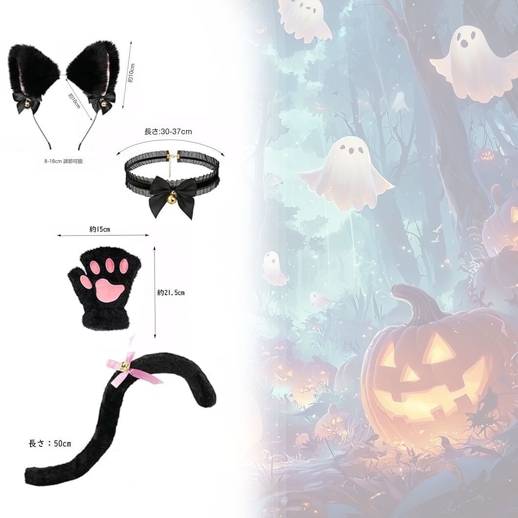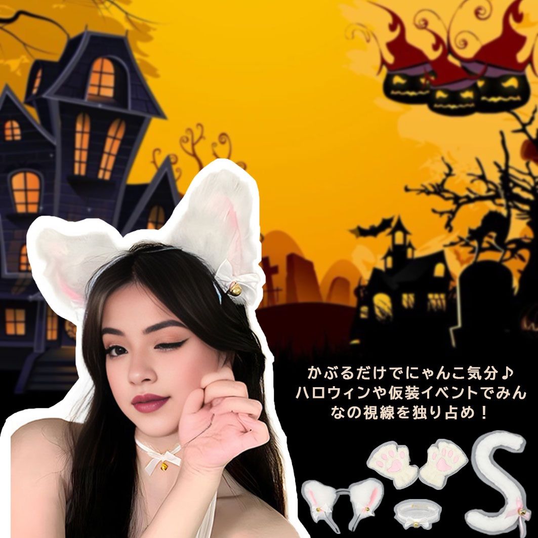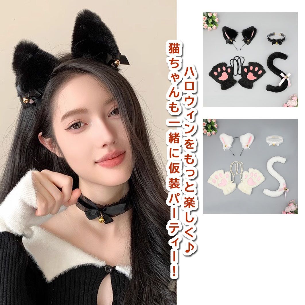 猫耳カチューシャ、チョーカー、グローブ、しっぽの便利な4点セットで、誰でも簡単に仮装ができます。