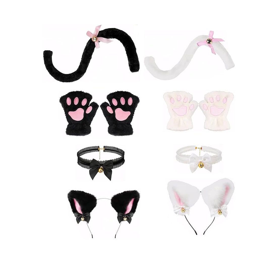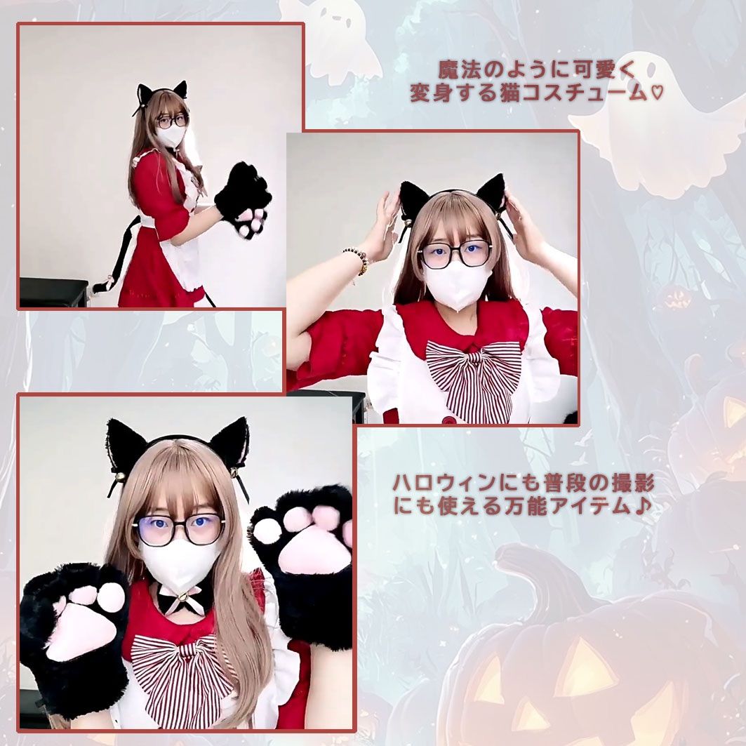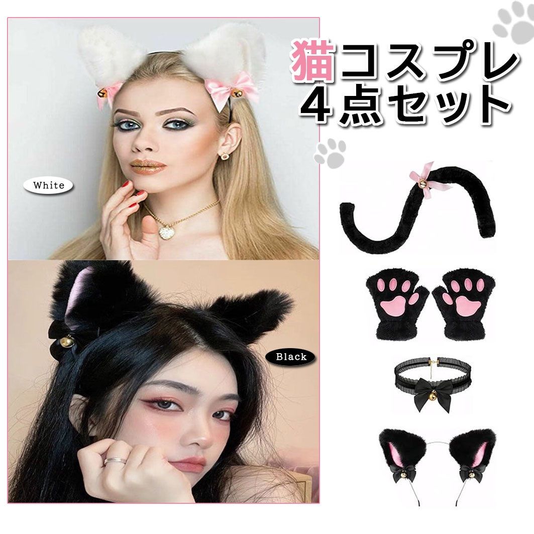 猫耳カチューシャ、チョーカー、グローブ、しっぽの便利な4点セットで、誰でも簡単に仮装ができます。