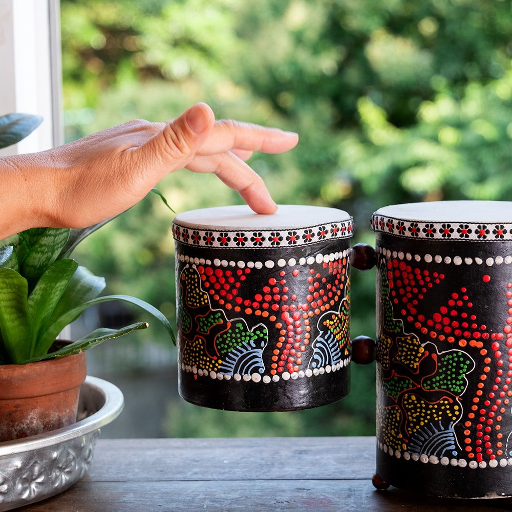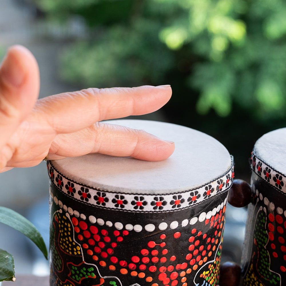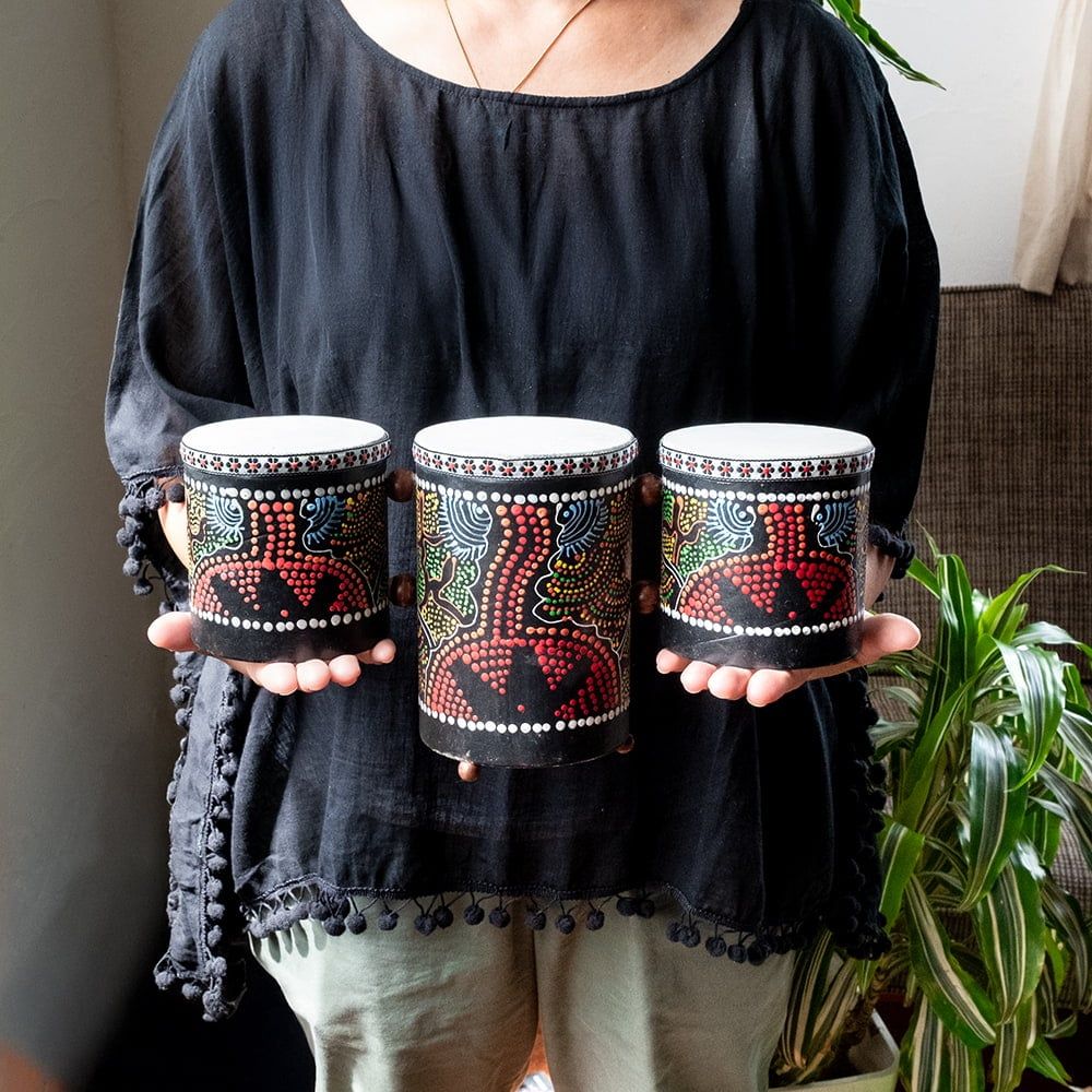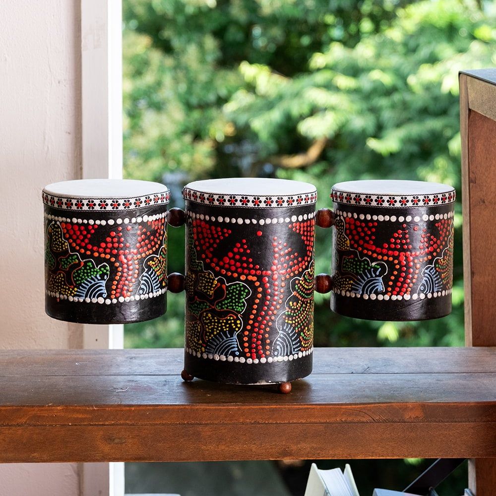 鮮やかなドットペイントが目を引く、バリ島の民族打楽器「ティンプトンドラム」です。3つの筒が横一列につながっていて、中心と左右で異なる音色を奏でます。1本付属する木製マレットと、もう片方の手を使って叩くことで、音の表情やリズムの変化を楽しめます。打ち方によって生まれる微妙な違いが、遊び心をくすぐります。