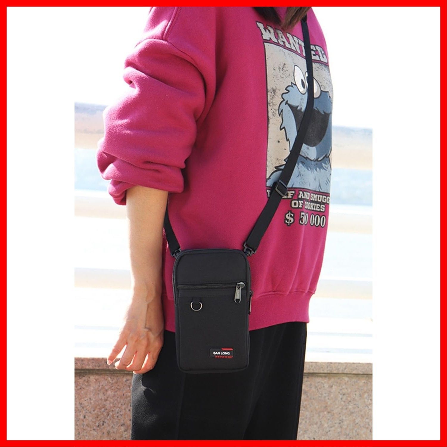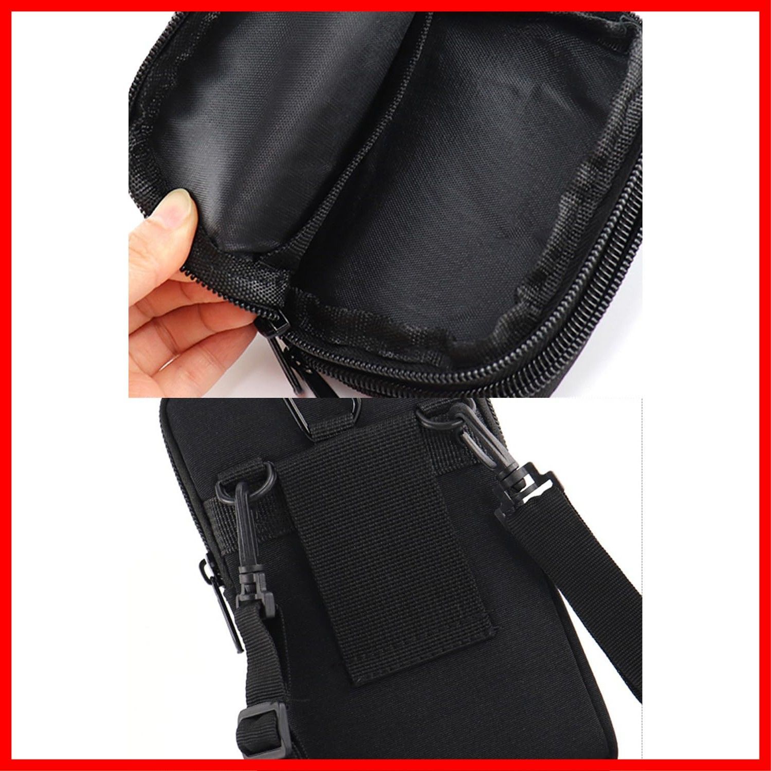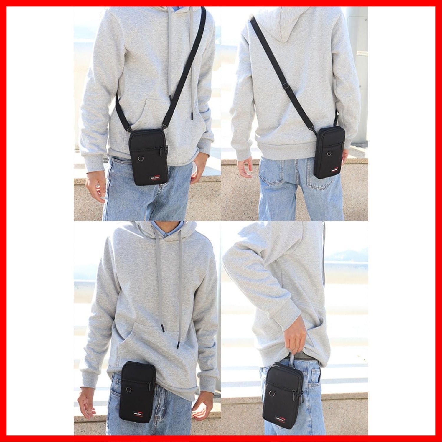 ショルダー紐とカラビナ付き、ショルダーバッグとして使用できるだけでなく、ベルトのバックルやバッグに取り付けることもできる。