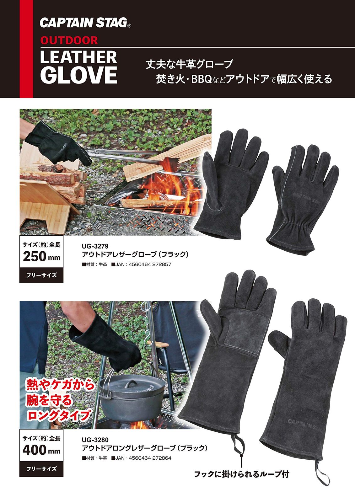 UG-3280 / UG-3279 ブラック 牛革 レザーグローブ 手袋 BBQ キャンプ アウトドア STAG) キャプテンスタッグ(CAPTAIN