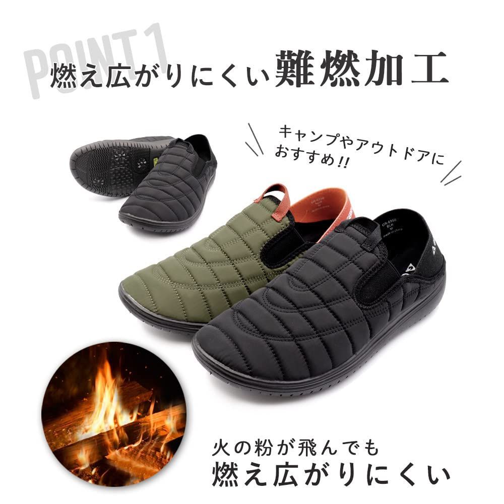 焚き火やBBQなどの火の粉が飛んでも燃え広がりにくい難燃加工が施されております。タウン履きはもちろん、カカトを踏んでも履けるのでキャンプなどのアウトドアに最適です。インソールには「もちもち」の高反発インソールを採用。軽量で脱ぎ履きが楽なおすすめのシューズです。※サイズに関して:25cm=S、26cm=M、27cm=L、28cm=LLとなっております。