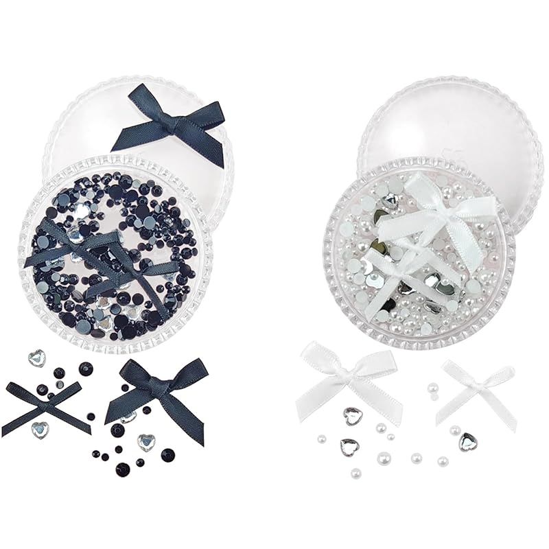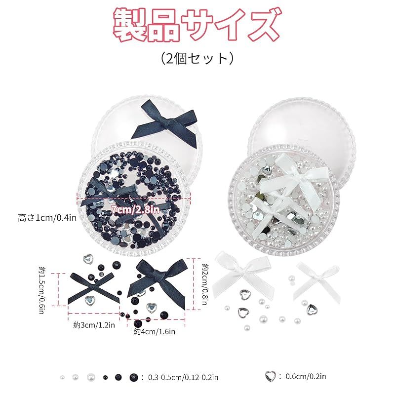 商品名:Seiunn ラインストーン メイクパーツ 【2個セット】 ネイルデコパーツ 顔面デコ 3D キラキラ かわいい メイクアップ用 携帯電話装飾 DIY用品 手芸用品 蝶結びのリボン ハート パール 丸形のダイヤモンド 収納ボックス付き (ホワイト+ブラック)