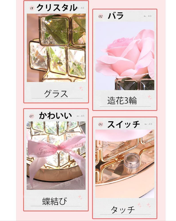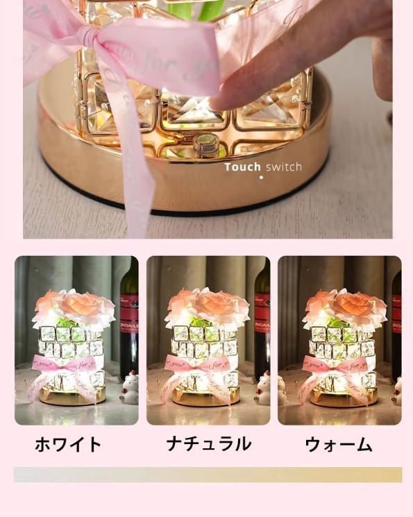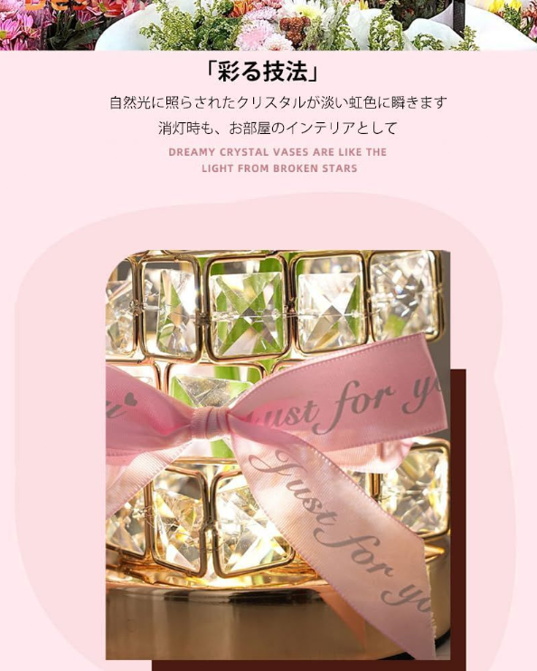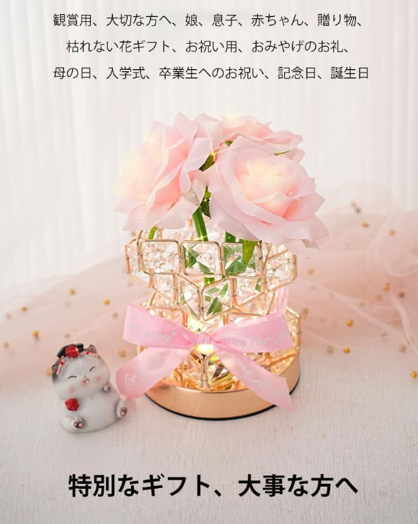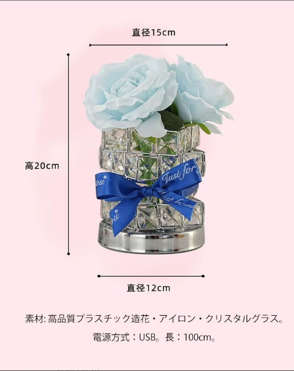 「商品仕様」商品サイズ:12x12x20cm。 ボックスサイズ:16x16x20cm。重さ:625グラム 。素材: 高品質プラスチック造花・アイロン・クリスタルグラス。電源方式:USB。長:100cm。