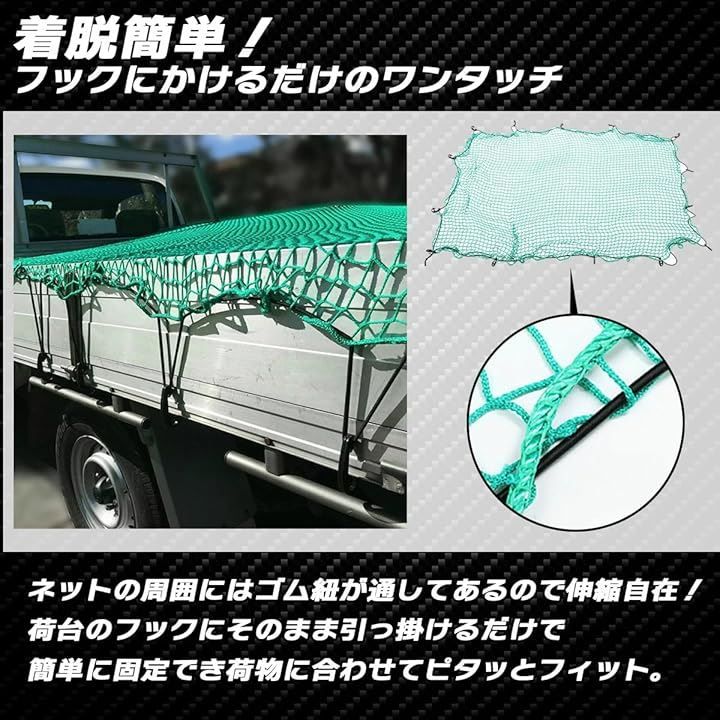 ネットの縁にはロープが通されており、荷台のフックポイントやキャリアバーに直接結び付けられる構造です。