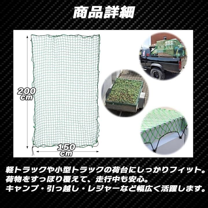 200x150cmの大判カーゴネットは、トラックの荷台やルーフキャリアに積んだ荷物をしっかり固定。