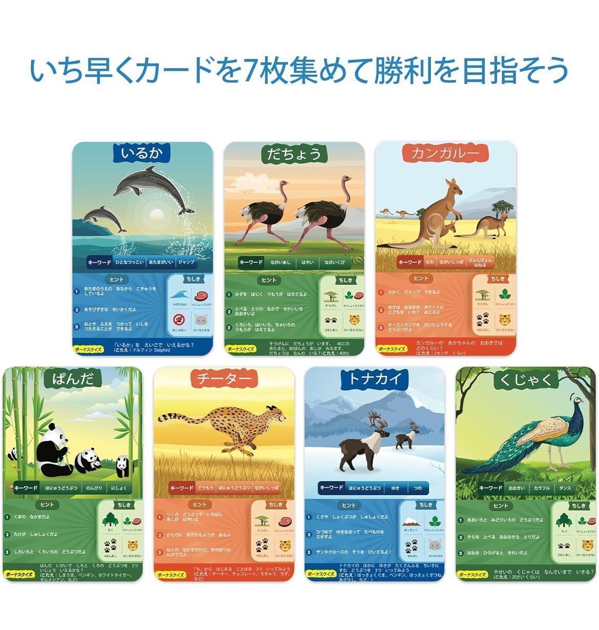 質問して頭が良くなるお手軽ゲーム:チームに分かれるか1対1でプレイして、ゲームカードに書かれた動物について、10個まで質問しましょう!その動物は肉食?飼いならせる?群れで暮らしている?よく考えて賢く質問しましょう。最初に7枚のゲームカードを集めた人が勝者になります!