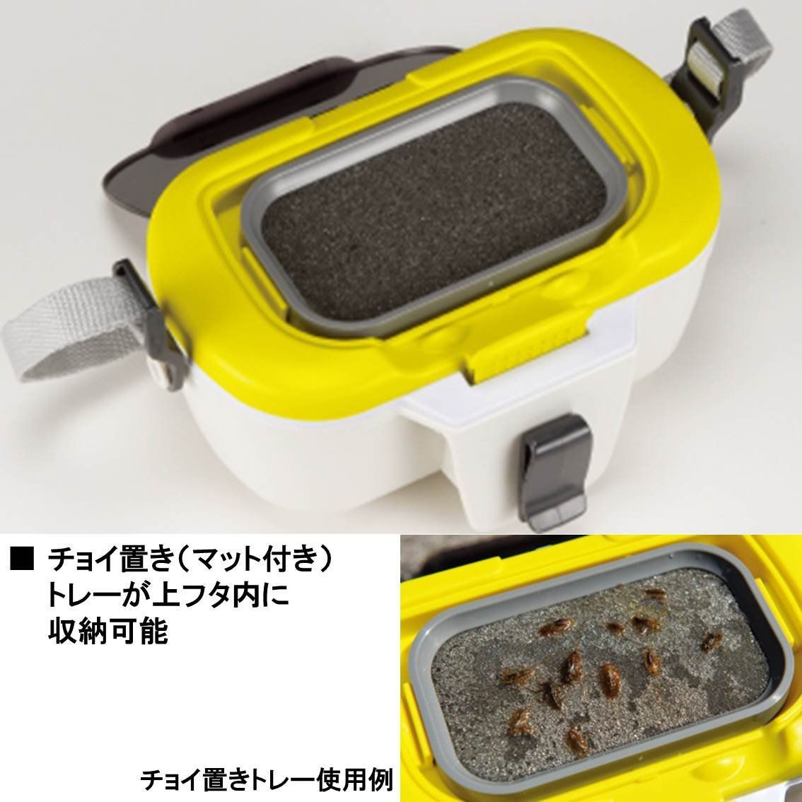 クールベイト 3 PRO●エサの小分け使用時に便利な「ちょい置き(マット付き)トレー」付き●立ち込んでもエサが濡れない首掛け式(首掛けベルトのたわみ防止機構、エサ箱を安定させるウェアークリップ付き)●エサの小分けに便利な深底ハーフトレイ2個入り
