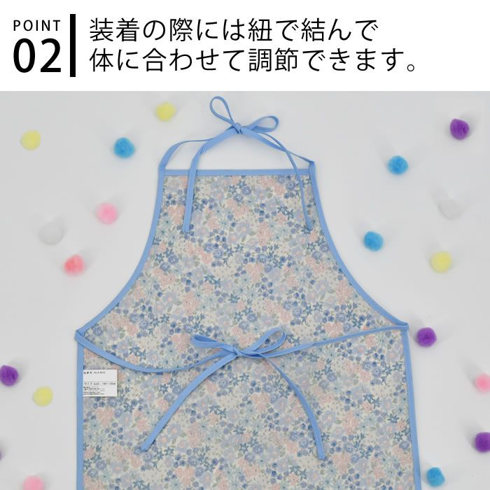 かわいい柄で女の子心をくすぐるデザイン! お料理のお手伝いもきっと楽しくなるはず♪ 装着の際は紐で結んで、体に合わせて調節できます。