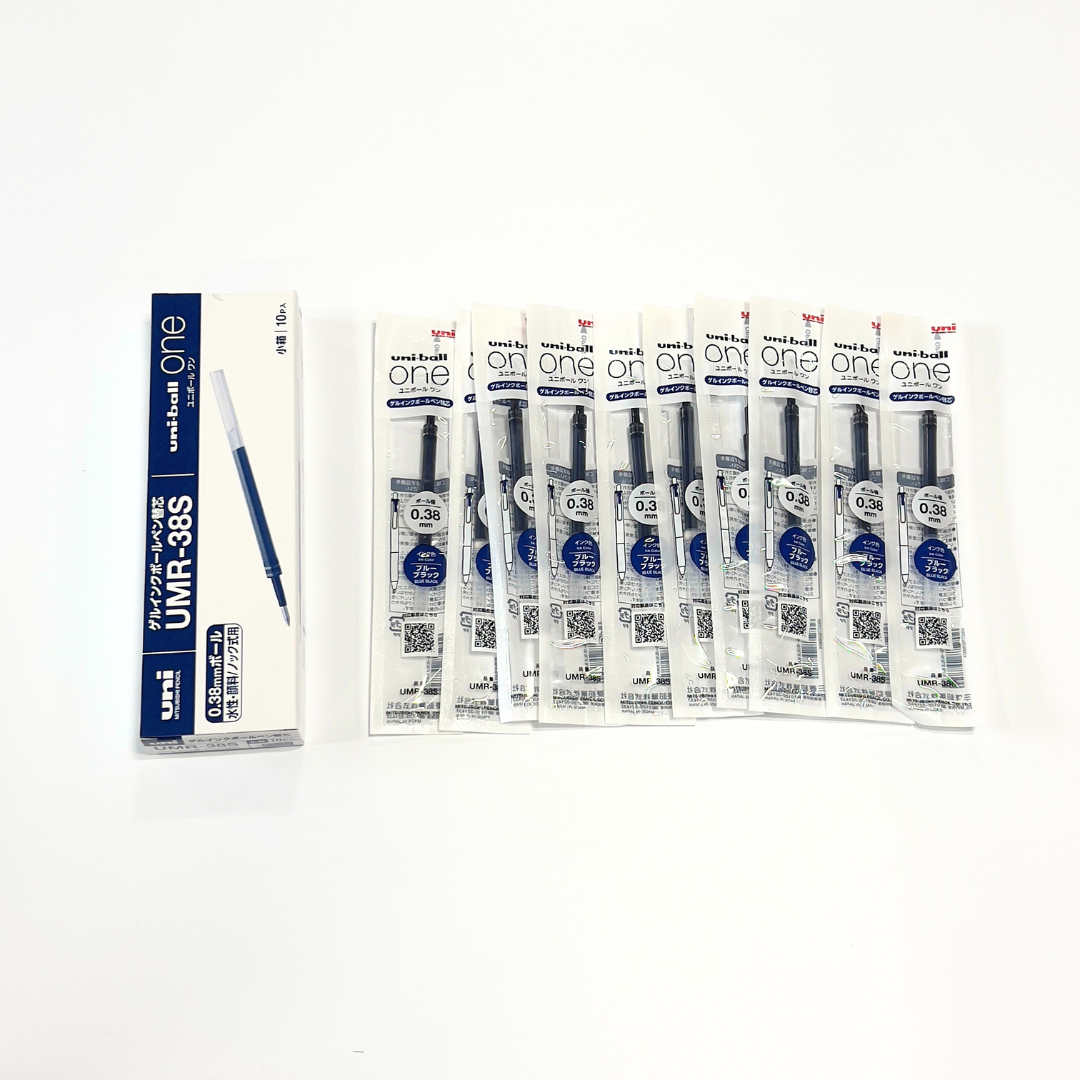 ユニボールワン専用のゲルインクボールペン替芯、0.38mmのブルーブラック10本セットです。 濃く鮮やかなインクで、くっきりとした文字が書け、手帳管理にもおすすめです。 速乾性があり、裏抜けしにくいので、見やすく印象的なノートや手帳が作れます。