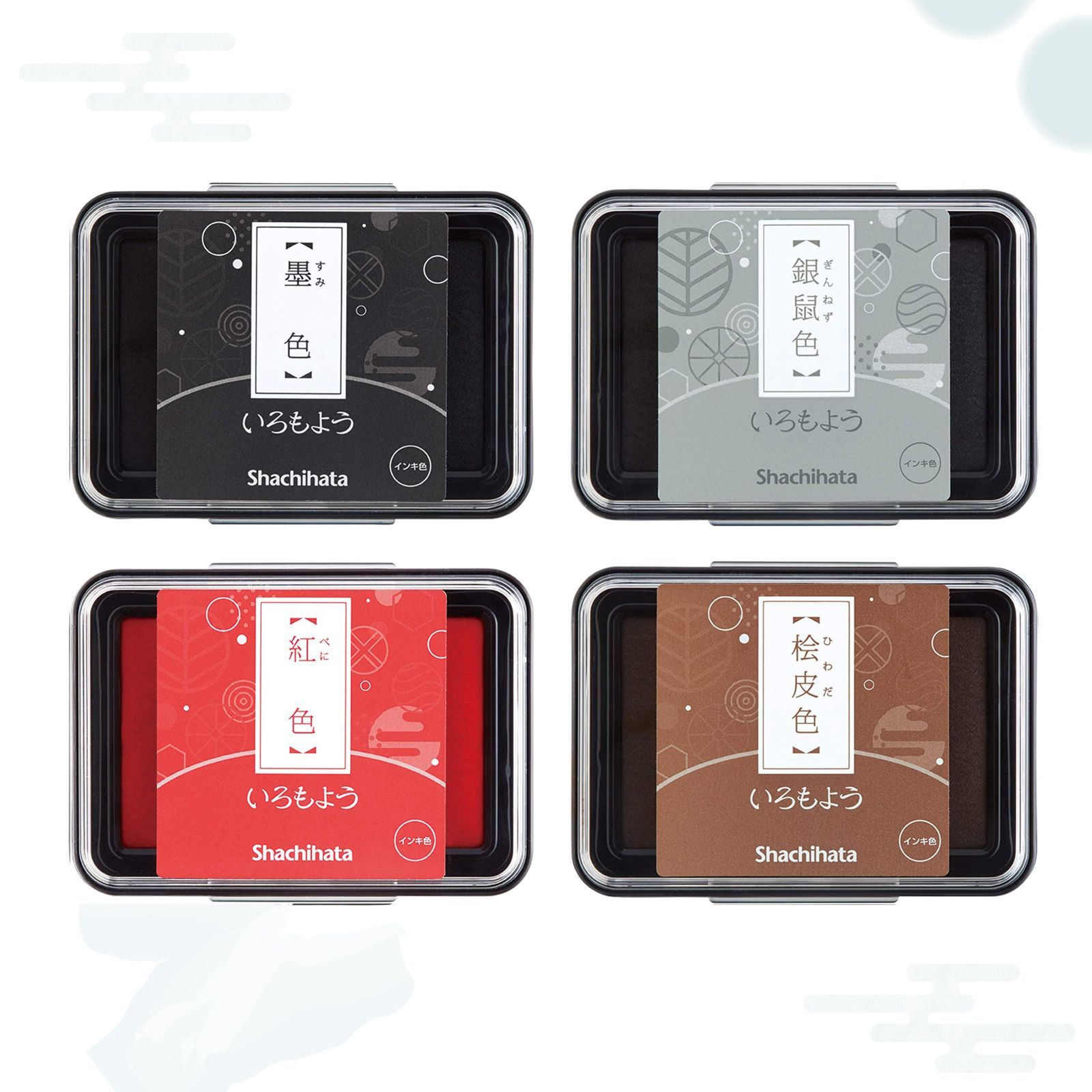 シャチハタ スタンプスタンド「いろもよう」の冬をイメージした【墨色】【銀鼠】【紅色】【桧皮色】の4色がセットになっています。