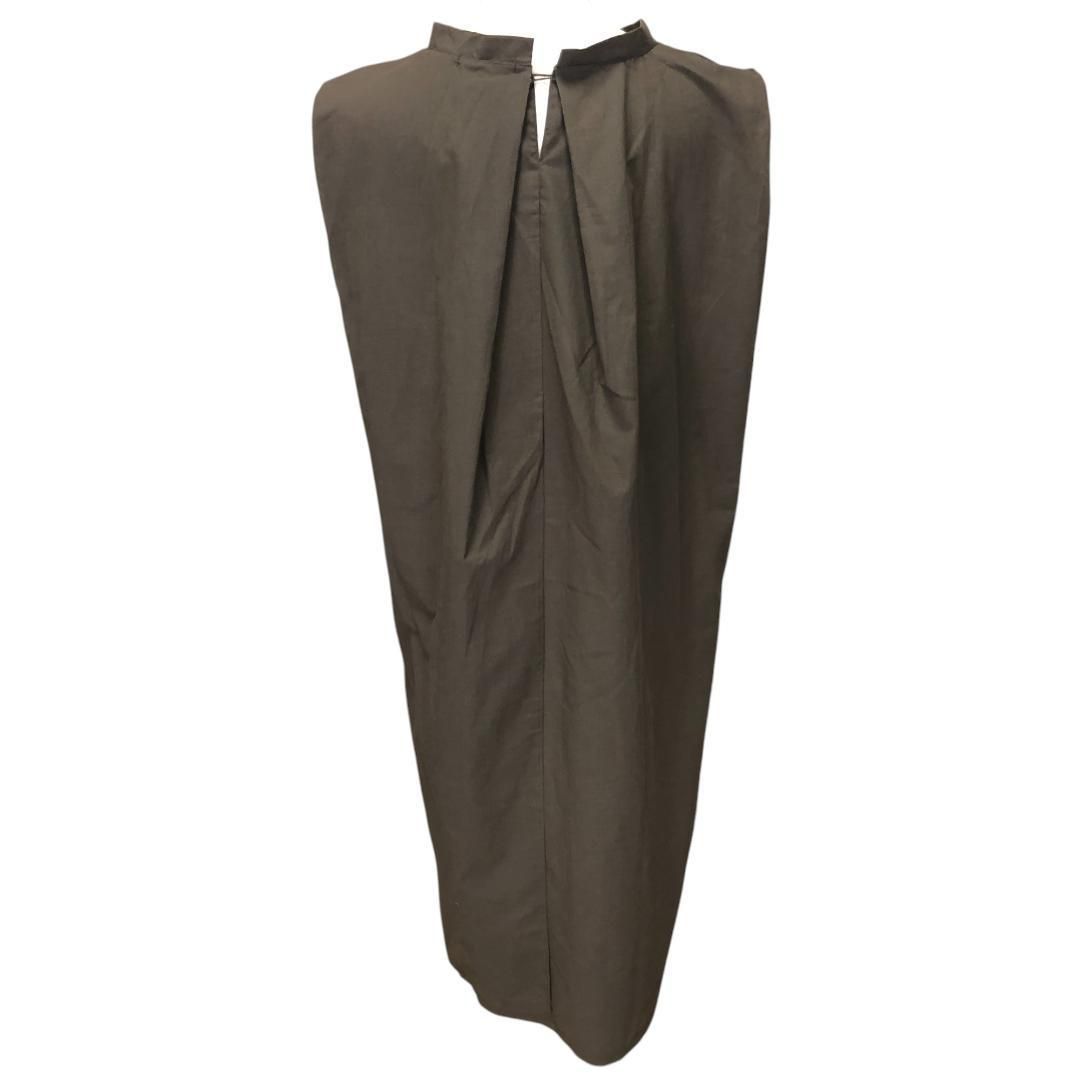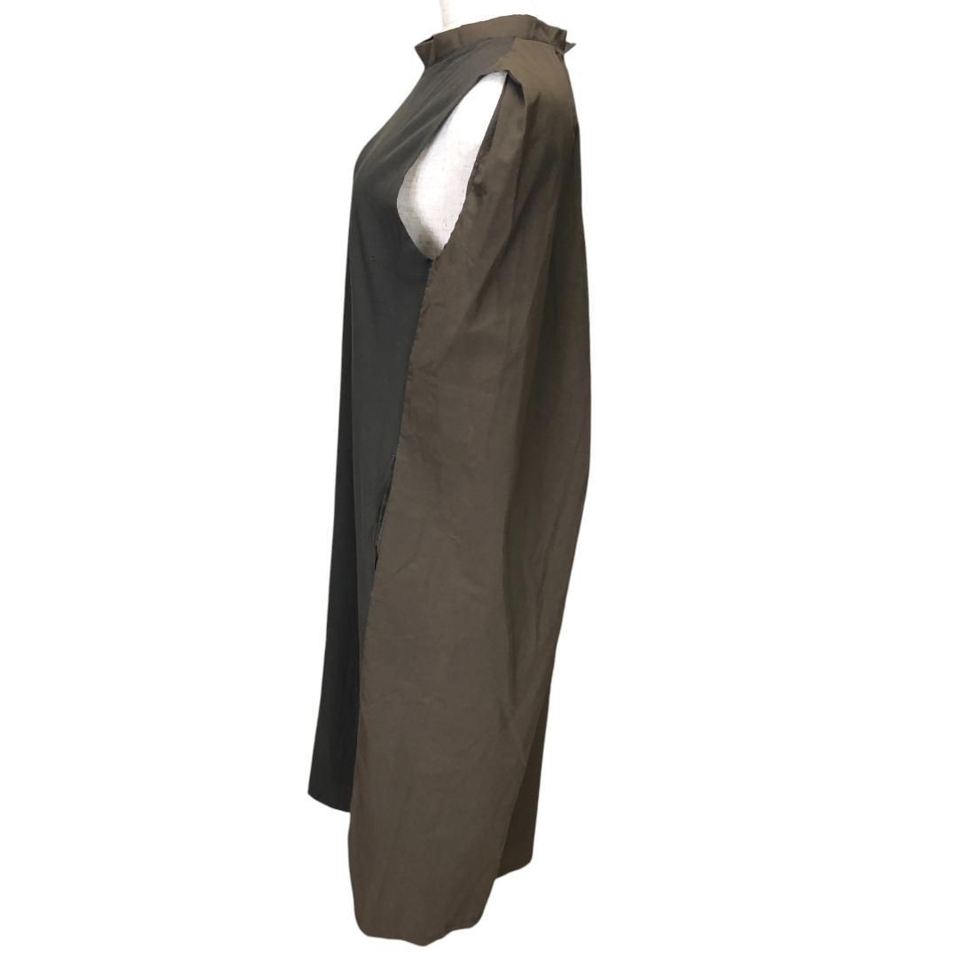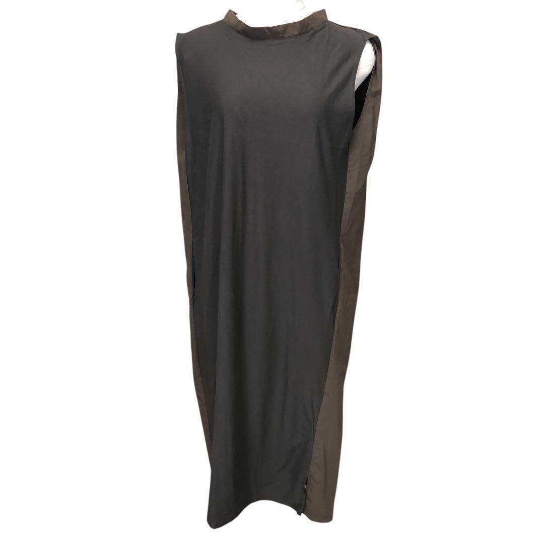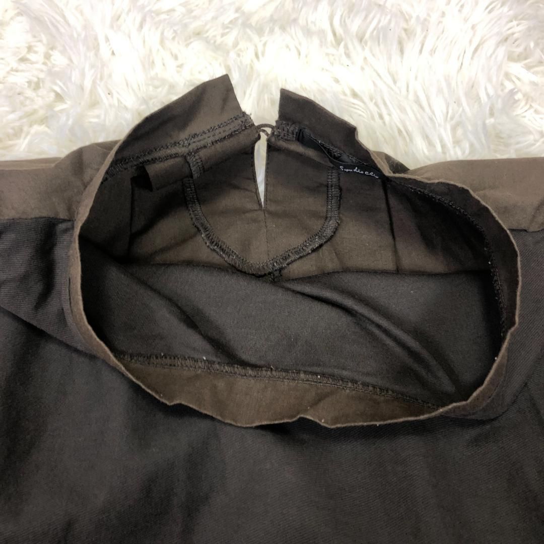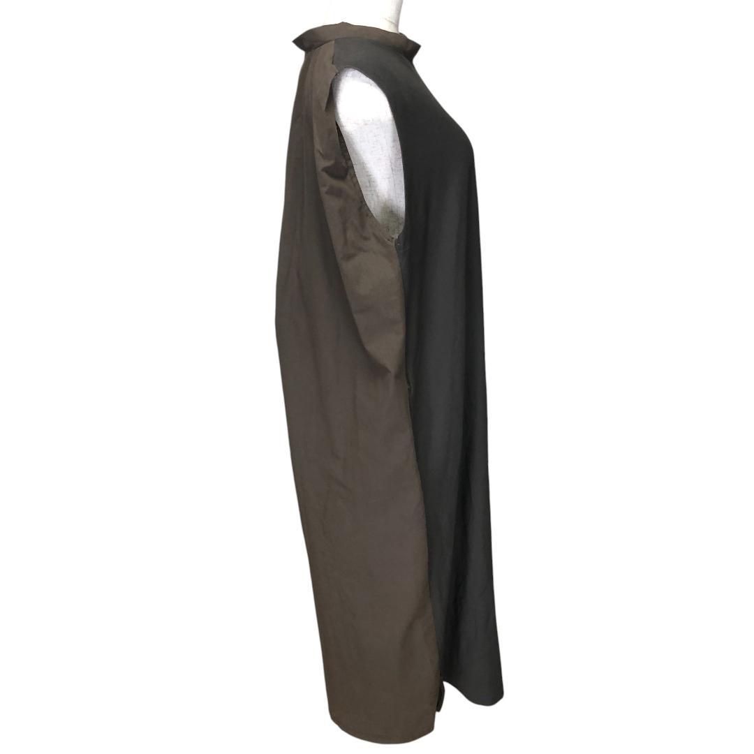 前真ん中部分(布帛)は伸縮性(ストレッチ)が効いた素材、他の部分(カットソー)は綿で構成された、異素材ドッキングのワンピースです。上から被るタイプです。後ろ側がキーホールネックデザインになっていてボタンにて着脱します。両サイド裾には12cmスリットが入っています。