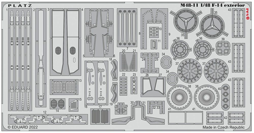 このセットは中でも機体外装のディテールアップパーツを収録したセットで、機体の仕上がりを繊細に仕上げるためのエッチングパーツで用意。脚のコード類をはじめ脚収納庫内部のディテール、エンジン後部の排気口内部をディテールアップするパーツなどをセットしています。プラスチックパーツとの置き換えや追加で仕上がりのメカニカルな表現を高めます。さらに、機体各部に装着されたフィレット、あるいは脚部分のディテールなど、シャープなエッチングパーツが仕上がりの雰囲気を高めます。